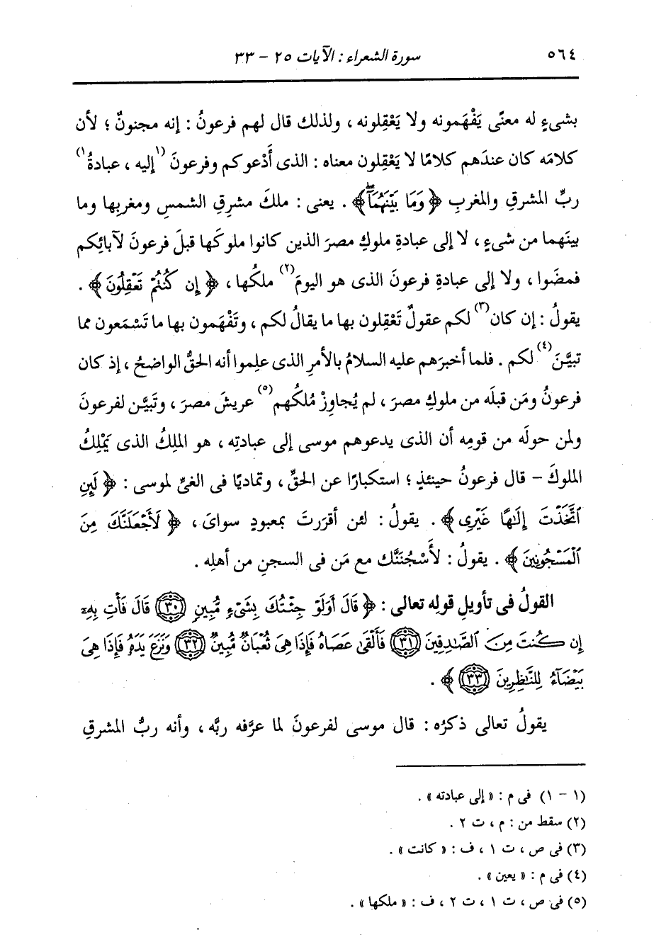 بِشَيْءٍ لَهُ مَعْنًى يَفْهَمُونَهُ وَلَا يَعْقِلُونَهُ، وَلِذَلِكَ قَالَ لَهُمْ فِرْعَوْنُ: إِنَّهُ مَجْنُونٌ، لِأَنَّ كَلَامَهُ كَانَ عِنْدَهُمْ كَلَامًا لَا يَعْقِلُونَ مَعْنَاهُ: الَّذِي أَدْعُوكُمْ وَفِرْعَوْنَ إِلَى عِبَادَتِهِ رَبُّ الْمَشْرِقِ وَالْمَغْرِبِ وَمَا بَيْنَهُمَا يَعْنِي مَلِكَ مَشْرِقِ الشَّمْسِ وَمَغْرِبِهَا، وَمَا بَيْنَهُمَا مِنْ شَيْءٍ، لَا إِلَى عِبَادَةِ مُلُوكِ مِصْرَ الَّذِينَ كَانُوا مُلُوكَهَا قَبْلَ فِرْعَوْنَ لِآبَائِكُمْ فَمَضَوْا، وَلَا إِلَى عِبَادَةِ فِرْعَوْنَ الَّذِي هُوَ مَلِكُهَا. {إِنْ كُنْتُمْ تَعْقِلُونَ} [آل عمران: 118] يَقُولُ: إِنْ كَانَ لَكُمْ عُقُولٌ تَعْقِلُونَ بِهَا مَا يُقَالُ لَكُمْ، وَتَفْهَمُونَ بِهَا مَا تَسْمَعُونَ مِمَّا يُعَيَّنُ لَكُمْ. فَلَمَّا أَخْبَرَهُمْ عَلَيْهِ السَّلَامُ بِالْأَمْرِ الَّذِي عَلِمُوا أَنَّهُ الْحَقُّ الْوَاضِحُ، إِذْ كَانَ فِرْعَوْنُ وَمَنْ قَبْلَهُ مِنْ مُلُوكِ مِصْرَ لَمْ يُجَاوِزْ مُلْكُهُمْ عَرِيشَ مِصْرَ، وَتَبَيَّنَ لِفِرْعَوْنَ وَمَنْ حَوْلَهُ مِنْ قَوْمِهِ أَنَّ الَّذِيَ يَدْعُوهُمْ مُوسَى إِلَى عِبَادَتِهِ، هُوَ الْمَلِكُ الَّذِي يَمْلِكُ الْمُلُوكَ. قَالَ فِرْعَوْنُ حِينَئِذٍ اسْتِكْبَارًا عَنِ الْحَقِّ، وَتَمَادِيًا فِي الْغَيِّ لِمُوسَى: {لَئِنِ اتَّخَذْتَ إِلَهًا غَيْرِي} [الشعراء: 29] يَقُولُ: لَئِنْ أَقْرَرْتَ بِمَعْبُودٍ سِوَايَ {لَأَجْعَلَنَّكَ مِنَ الْمَسْجُونِينَ} [الشعراء: 29] يَقُولُ: لَأَسْجُنَنَّكَ مَعَ مَنْ فِي السِّجْنِ مِنْ أَهْلِهِ