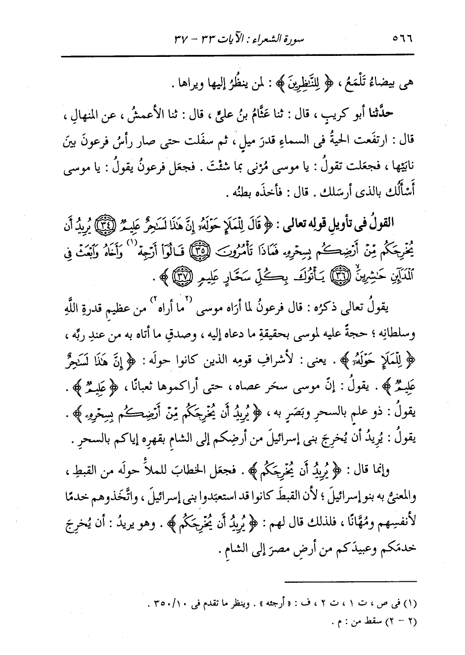 §الْقَوْلُ فِي تَأْوِيلِ قَوْلِهِ تَعَالَى: {قَالَ لَلْمَلَإِ حَوْلَهُ إِنَّ هَذَا لَسَاحِرٌ عَلِيمٌ. يُرِيدُ أَنْ يُخْرِجَكُمْ مِنْ أَرْضِكُمْ بِسِحْرِهِ فَمَاذَا تَأْمُرُونَ. قَالُوا أَرْجِهْ وَأَخَاهُ وَابْعَثْ فِي الْمَدَائِنِ حَاشِرِينَ. يَأْتُوكَ بِكُلِّ سَحَّارٍ عَلِيمٍ} [الشعراء: 35] يَقُولُ تَعَالَى ذِكْرُهُ: قَالَ فِرْعَوْنُ لَمَّا أَرَاهُ مُوسَى مِنْ عَظِيمِ قُدْرَةِ اللَّهِ وَسُلْطَانِهِ حُجَّةً عَلَيْهِ لِمُوسَى بِحَقِيقَةِ مَا دَعَاهُ إِلَيْهِ وَصِدْقِ مَا أَتَاهُ بِهِ مِنْ عِنْدِ رَبِّهِ {لِلْمَلَإِ حَوْلَهُ} [الشعراء: 34] يَعْنِي لَأَشْرَافِ قَوْمِهِ الَّذِينَ كَانُوا حَوْلَهُ: {إنَّ هَذَا لَساحِرٌ عَلِيمٌ} [الأعراف: 109] يَقُولُ: إِنَّ مُوسَى سَحَرَ عَصَاهُ حَتَّى أَرَاكُمُوهَا ثُعْبَانًا {عَلِيمٌ} [البقرة: 29] ، يَقُولُ: ذُو عِلْمٍ بِالسِّحْرِ وَبَصَرٍ بِهِ. {يُريدُ أَنْ يُخْرِجَكُمْ مِنْ أَرْضِكُمْ بِسِحْرِهِ} [الشعراء: 35] يَقُولُ: يُرِيدُ أَنْ يُخْرِجَ بَنِي إِسْرَائِيلَ مِنْ أَرْضِكُمْ إِلَى الشَّأْمِ بِقَهْرِهِ إِيَّاكُمْ بِالسِّحْرِ. وَإِنَّمَا قَالَ: يُرِيدُ أَنْ يُخْرِجَكُمْ فَجَعَلَ الْخِطَابَ لِلْمَلَإِ حَوْلَهُ مِنَ الْقِبْطِ، وَالْمَعْنِيُّ بِهِ بَنُو إِسْرَائِيلَ، لِأَنَّ الْقِبْطَ كَانُوا قَدِ اسْتَعْبَدُوا بَنِي إِسْرَائِيلَ، وَاتَّخَذُوهُمْ خَدَمًا لِأَنْفُسِهِمْ وَمَهَانًا، فَلِذَلِكَ قَالَ لَهُمْ: {يُرِيدُ أَنْ يُخْرِجَكُمْ} [الأعراف: 110] وَهُوَ يُرِيدُ: أَنْ يُخْرِجَ خَدَمَكُمْ وَعَبِيدَكُمْ مِنْ أَرْضِ مِصْرَ إِلَى الشَّأْمِ.