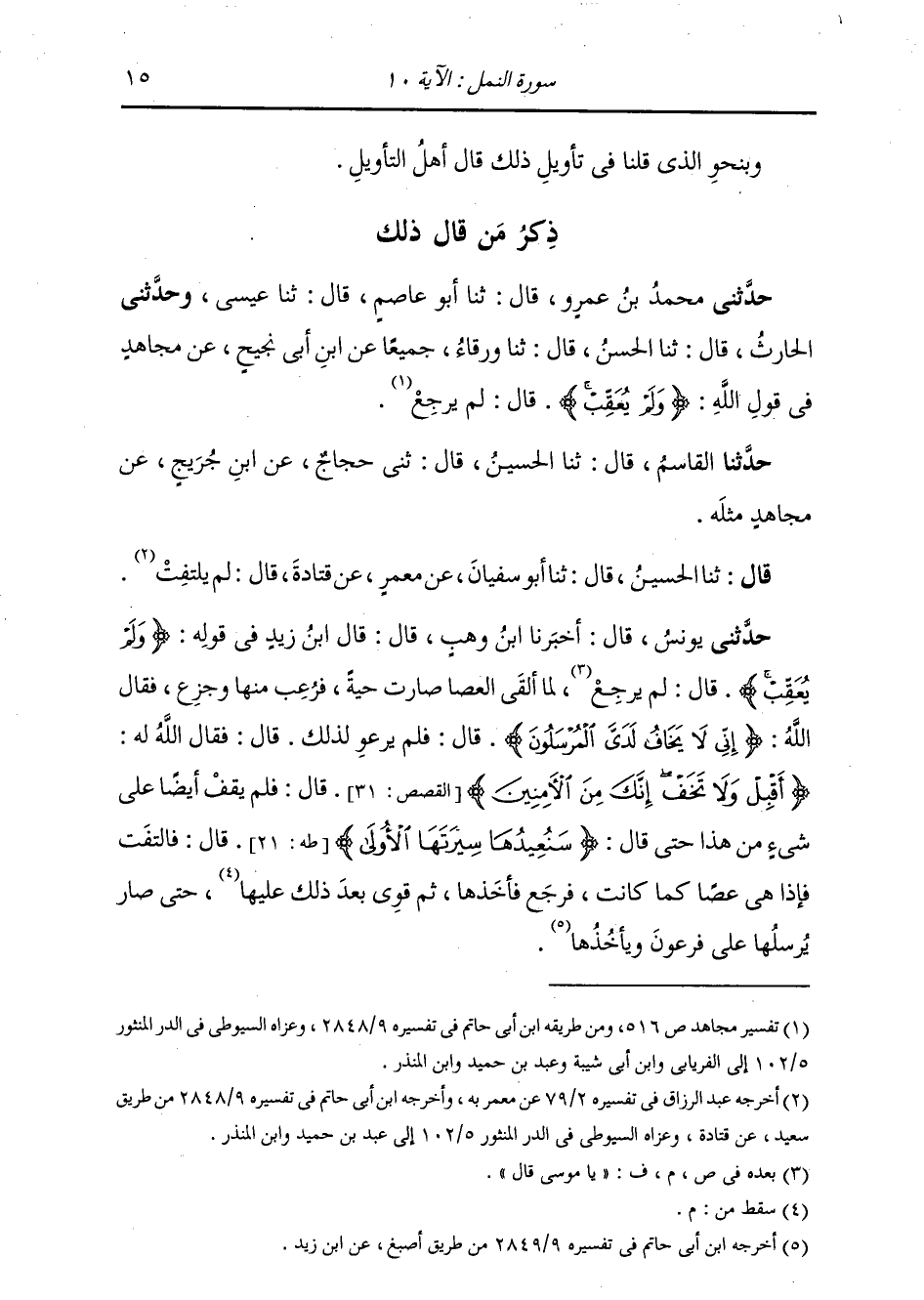 ذِكْرُ مَنْ قَالَ ذَلِكَ: حَدَّثَنِي مُحَمَّدُ بْنُ عَمْرٍو، قَالَ: ثنا أَبُو عَاصِمٍ، قَالَ: ثنا عِيسَى، وَحَدَّثَنِي الْحَارِثُ، قَالَ: ثنا الْحَسَنُ، قَالَ: ثنا وَرْقَاءُ، جَمِيعًا، عَنِ ابْنِ أَبِي نَجِيحٍ، عَنْ مُجَاهِدٍ، فِي قَوْلِ اللَّهِ: " {§وَلَمْ يُعَقِّبْ} [النمل: 10] قَالَ: لَمْ يَرْجِعْ ". حَدَّثَنَا الْقَاسِمُ، قَالَ: ثنا الْحُسَيْنُ، قَالَ: ثني حَجَّاجٌ، عَنِ ابْنِ جُرَيْجٍ، عَنْ مُجَاهِدٍ، مِثْلَهُ