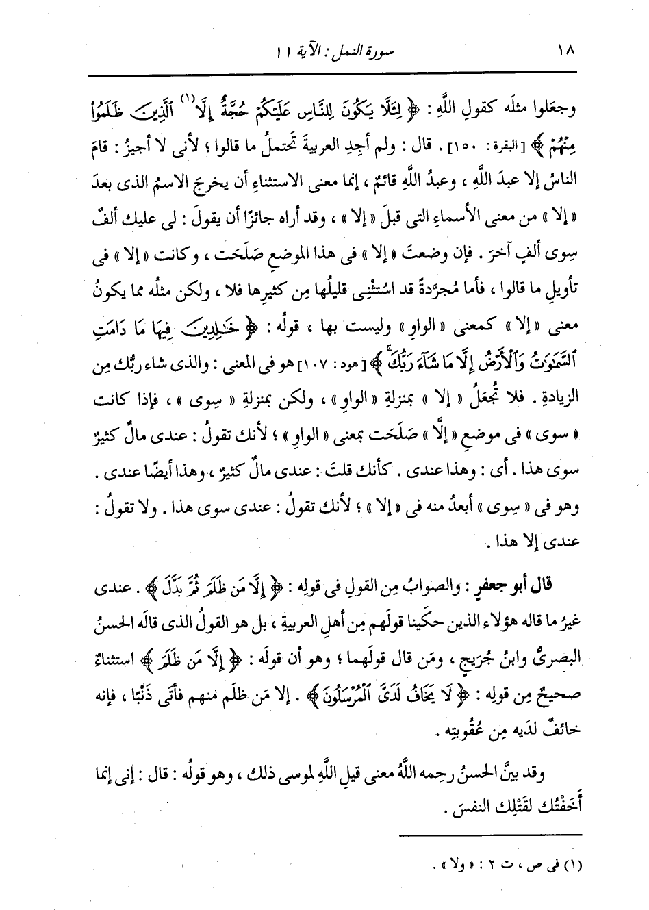 وَجَعَلُوا مِثْلَهُ كَقَوْلِ اللَّهِ: {لِئَلَّا يَكُونَ لِلنَّاسِ عَلَيْكُمْ حَجَّةٌ إِلَّا الَّذِينَ ظَلَمُوا مِنْهُمْ} [البقرة: 150] قَالَ: وَلَمْ أَجِدِ الْعَرَبِيَّةَ تَحْتَمِلُ مَا قَالُوا، لِأَنِّي لَا أُجِيزُ: قَامَ النَّاسُ إِلَّا عَبْدَ اللَّهِ، وَعَبْدُ اللَّهِ قَائِمٌ؛ إِنَّمَا مَعْنَى الِاسْتِثْنَاءُ أَنْ يَخْرُجَ الِاسْمُ الَّذِي بَعْدَ إِلَّا مِنْ مَعْنَى الْأَسْمَاءِ الَّتِي قَبْلَ إِلَّا. وَقَدْ أُرَاهُ جَائِزًا أَنْ يَقُولَ: لِي عَلَيْكَ أَلْفٌ سِوَى أَلْفٍ آخَرَ؛ فَإِنْ وَضَعْتَ إِلَّا فِي هَذَا الْمَوْضِعِ صَلَحَتْ، وَكَانَتْ إِلَّا فِي تَأْوِيلِ مَا قَالُوا، فَأَمَّا مُجَرَّدَةً قَدِ اسْتَثْنَى قَلِيلَهَا مِنْ كَثِيرِهَا فَلَا، وَلَكِنْ مِثْلُهُ مِمَّا يَكُونُ مَعْنَى إِلَّا كَمَعْنَى الْوَاوِ، وَلَيْسَتْ بِهَا قَوْلُهُ {خَالِدِينَ فِيهَا مَا دَامَتِ السَّمَوَاتُ وَالْأَرْضُ إِلَّا مَا شَاءَ رَبُّكَ} هُوَ فِي الْمَعْنَى. وَالَّذِي شَاءَ رَبُّكَ مِنَ الزِّيَادَةِ، فَلَا تُجْعَلْ إِلَّا بِمَنْزِلَةِ الْوَاوِ، وَلَكِنْ بِمَنْزِلَةِ سِوَى؛ فَإِذَا كَانَتْ «سِوَى» فِي مَوْضِعِ «إِلَّا» صَلَحَتْ بِمَعْنَى الْوَاوِ، لِأَنَّكَ تَقُولُ: عِنْدِي مَالٌ كَثِيرٌ سِوَى هَذَا: أَيْ وَهَذَا عِنْدِي، كَأَنَّكَ قُلْتَ: عِنْدِي مَالٌ كَثِيرٌ وَهَذَا أَيْضًا عِنْدِي، وَهُوَ فِي سِوَى أَبْعَدُ مِنْهُ فِي إِلَّا، لِأَنَّكَ تَقُولُ: عِنْدِي سِوَى هَذَا، وَلَا تَقُولُ: عِنْدِي إِلَّا هَذَا قَالَ أَبُو جَعْفَرٍ: وَالصَّوَابُ مِنَ الْقَوْلِ فِي قَوْلِهِ {إِلَّا مَنْ ظَلَمَ ثُمَّ بَدَّلَ} [النمل: 11] عِنْدِي غَيْرُ مَا قَالَهُ هَؤُلَاءِ الَّذِينَ حَكَيْنَا قَوْلُهُمْ مِنْ أَهْلِ الْعَرَبِيَّةِ، بَلْ هُوَ الْقَوْلُ الَّذِي قَالَهُ الْحَسَنُ الْبَصْرِيُّ وَابْنُ جُرَيْجٍ وَمَنْ قَالَ قَوْلَهُمَا، وَهُوَ أَنَّ قَوْلَهُ: {إِلَّا مَنْ ظَلَمَ} [النساء: 148] اسْتِثْنَاءٌ صَحِيحٌ مِنْ قَوْلِهِ {لَا يَخَافُ لَدَيَّ الْمُرْسَلُونَ إِلَّا مَنْ ظَلَمَ} [النمل: 10] مِنْهُمْ فَأَتَى ذَنْبًا، فَإِنَّهُ خَائِفٌ لَدَيْهِ مِنْ عُقُوبَتِهِ. وَقَدْ بَيَّنَ الْحَسَنُ رَحِمَهُ اللَّهُ مَعْنَى قِيلِ اللَّهِ لِمُوسَى ذَلِكَ، وَهُوَ قَوْلُهُ قَالَ: «إِنِّي إِنَّمَا أَخَفْتُكَ لِقَتْلِكَ النَّفْسَ» .