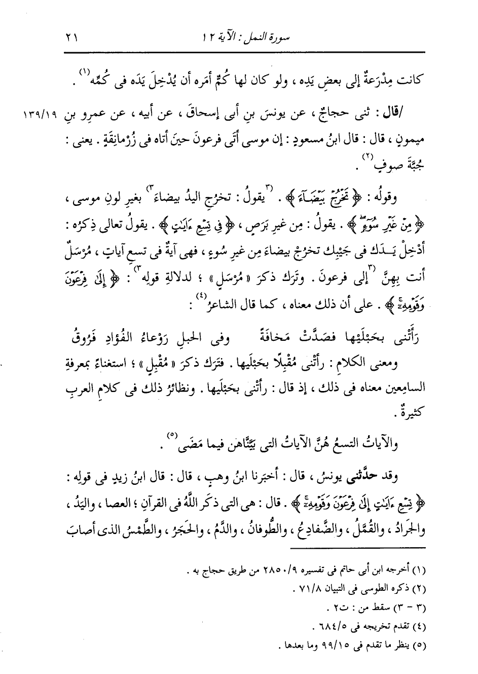 وَمَعْنَى الْكَلَامِ: رَأَتْنِي مُقْبِلًا بِحَبْلَيْهَا، فَتَرَكَ ذِكْرَ مُقْبِلٍ اسْتِغْنَاءً بِمَعْرِفَةِ السَّامِعِينَ مَعْنَاهُ فِي ذَلِكَ، إِذْ قَالَ: رَأَتْنِي بِحَبْلَيْهَا؛ وَنَظَائِرُ ذَلِكَ فِي كَلَامِ الْعَرَبِ كَثِيرَةٌ. وَالْآيَاتُ التِّسْعُ: هُنَّ الْآيَاتُ الَّتِي بَيَّنَّاهُنَّ فِيمَا مَضَى.