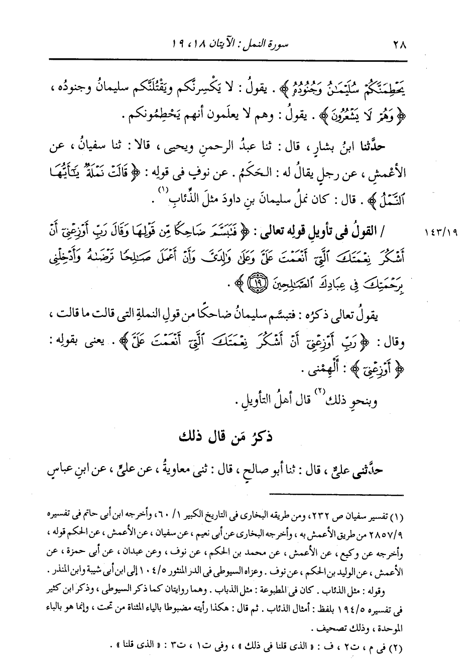 §الْقَوْلُ فِي تَأْوِيلِ قَوْلِهِ تَعَالَى: {فَتَبَسَّمَ ضَاحِكًا مِنْ قَوْلِهَا وَقَالَ رَبِّ أَوْزِعْنِي أَنْ أَشْكُرَ نِعْمَتَكَ الَّتِي أَنْعَمْتَ عَلَيَّ وَعَلَى وَالِدَيَّ، وَأَنْ أَعْمَلَ صَالِحًا تَرْضَاهُ، وَأَدْخِلْنِي بِرَحْمَتِكَ فِي عِبَادِكَ الصَّالِحِينَ} [النمل: 19] يَقُولُ تَعَالَى ذِكْرُهُ: فَتَبَسَّمَ سُلَيْمَانُ ضَاحِكًا مِنْ قَوْلِ النَّمْلَةِ الَّتِي قَالَتْ مَا قَالَتْ، وَقَالَ: {رَبِّ أَوْزِعْنِي أَنْ أَشْكُرَ نِعْمَتَكَ الَّتِي أَنْعَمْتَ عَلَيَّ} [النمل: 19] يَعْنِي بِقَوْلِهِ {أَوْزِعْنِي} [النمل: 19] أَلْهِمْنِي. وَبِنَحْوِ الَّذِي قُلْنَا فِي ذَلِكَ قَالَ أَهْلُ التَّأْوِيلِ.