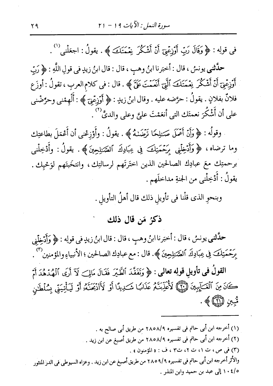 ذِكْرُ مَنْ قَالَ ذَلِكَ: حَدَّثَنِي يُونُسُ، قَالَ: أَخْبَرَنَا ابْنُ وَهْبٍ، قَالَ: قَالَ ابْنُ زَيْدٍ، فِي قَوْلِهِ: " {§وَأَدْخِلْنِي بِرَحْمَتِكَ فِي عِبَادِكَ الصَّالِحِينَ} [النمل: 19] قَالَ: مَعَ عِبَادِكَ الصَّالِحِينَ الْأَنْبِيَاءِ وَالْمُؤْمِنِينَ "