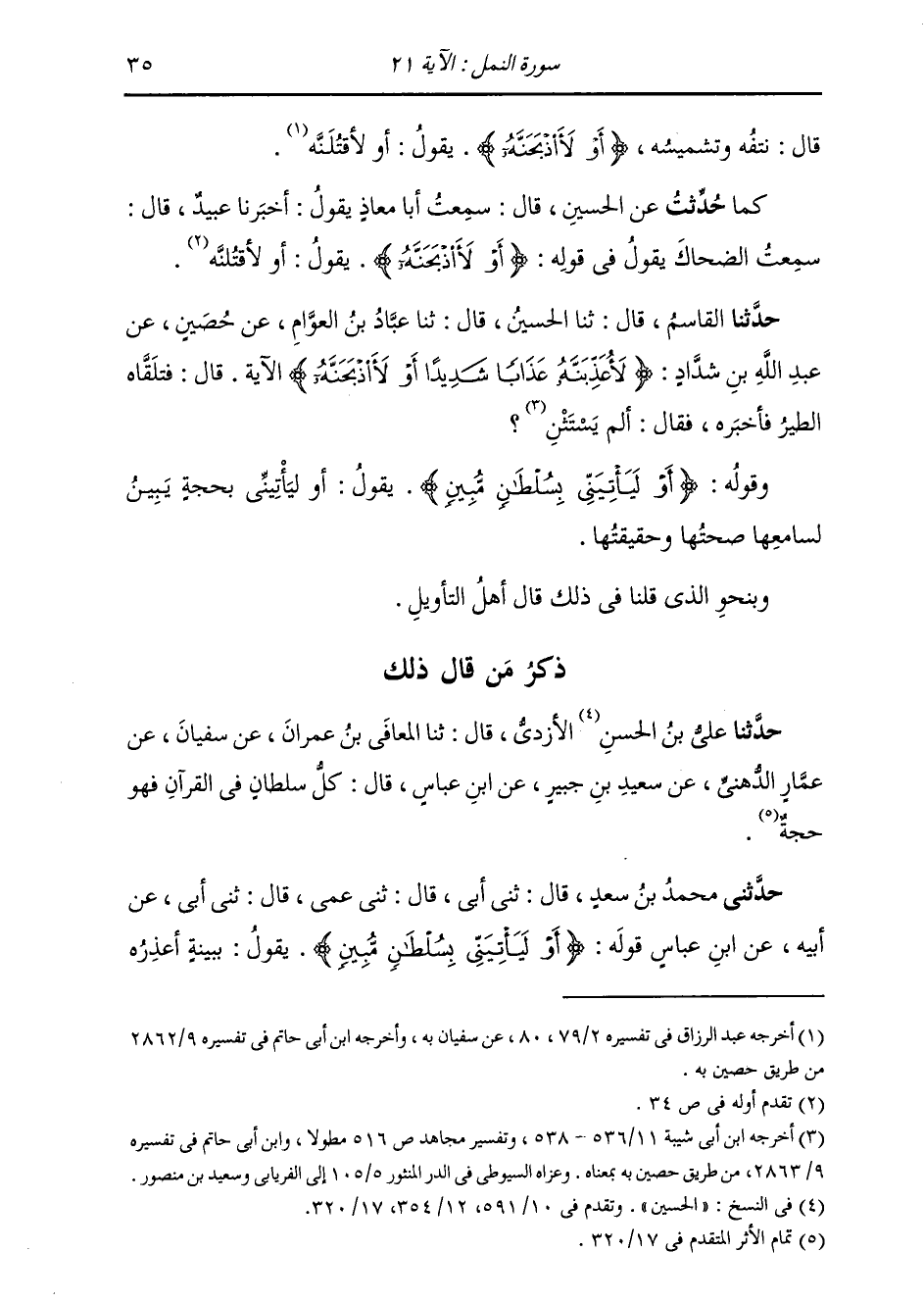 حَدَّثَنِي مُحَمَّدُ بْنُ سَعْدٍ، قَالَ: ثني أَبِي، قَالَ: ثني عَمِّي، قَالَ: ثني أَبِي، عَنْ أَبِيهِ، عَنِ ابْنِ عَبَّاسٍ، قَوْلَهُ: " {§أَوْ لَيَأْتِيَنِّي بِسُلْطَانٍ مُبِينٍ} [النمل: 21] يَقُولُ: بِبَيِّنَةٌ أَعْذُرُهُ -[36]- بِهَا، وَهُوَ مِثْلُ قَوْلِهِ: {الَّذِينَ يُجَادِلُونَ فِي آيَاتِ اللَّهِ بِغَيْرِ سُلْطَانٍ} [غافر: 35] يَقُولُ: بِغَيْرِ بَيِّنَةٍ "
