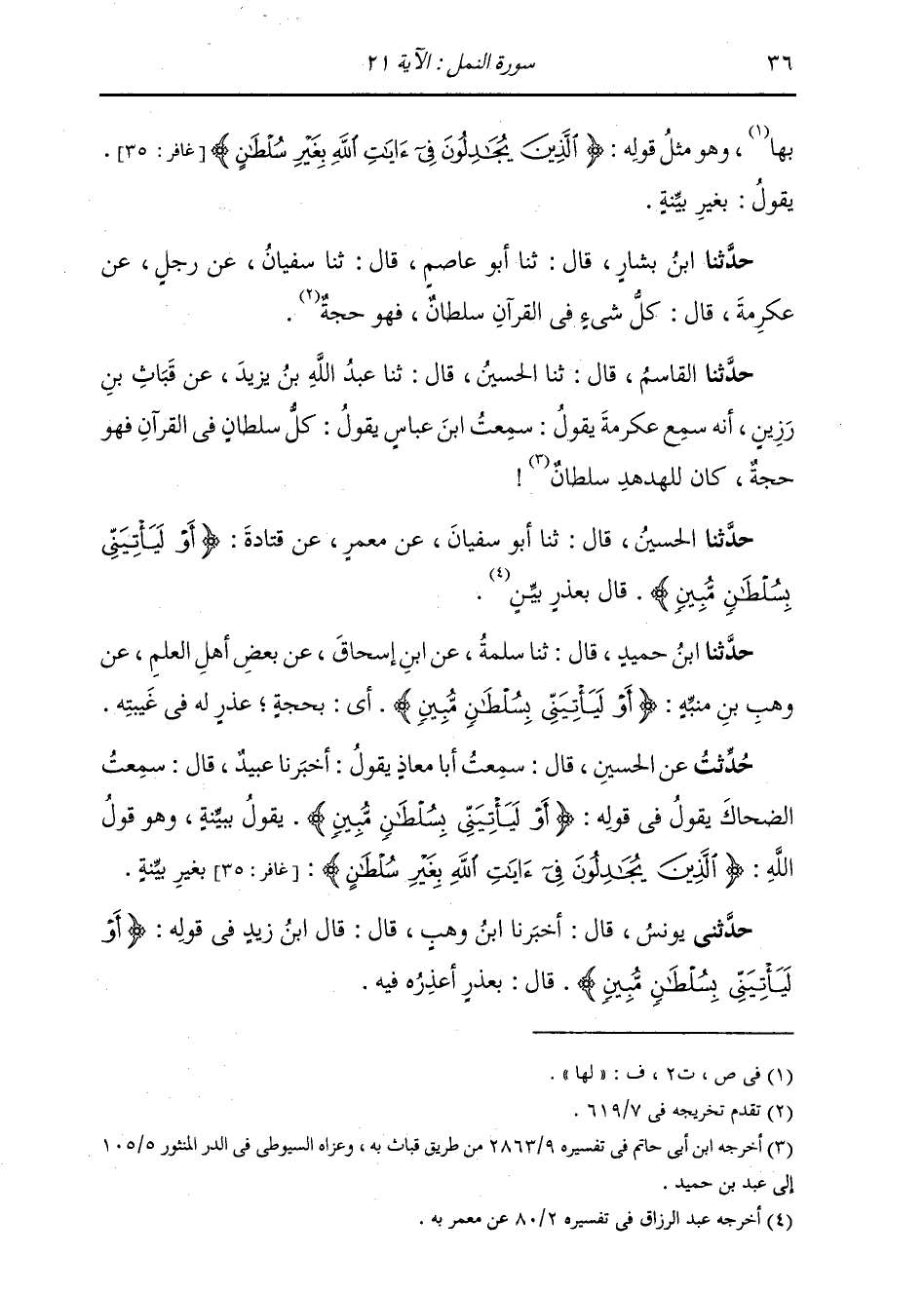 حُدِّثْتُ عَنِ الْحُسَيْنِ، قَالَ: سَمِعْتُ أَبَا مُعَاذٍ، يَقُولُ: أَخْبَرَنَا عُبَيْدٌ، قَالَ: سَمِعْتُ الضَّحَّاكَ يَقُولُ فِي قَوْلِهِ: " {§أَوْ لَيَأْتِيَنِّي بِسُلْطَانٍ مُبِينٍ} [النمل: 21] يَقُولُ: بِبَيِّنَةٍ، وَهُوَ قَوْلُ اللَّهِ {الَّذِينَ يُجَادِلُونَ فِي آيَاتِ اللَّهِ بِغَيْرِ سُلْطَانٍ} [غافر: 35] بِغَيْرِ بَيِّنَةٍ "