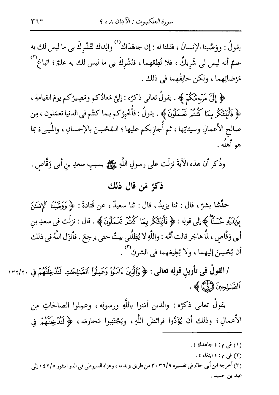 {§إِلَيَّ مَرْجِعُكُمْ} [آل عمران: 55] يَقُولُ تَعَالَى ذِكْرُهُ: إِلَيَّ مُعَادُكُمْ وَمَصِيرُكُمْ يَوْمَ الْقِيَامَةِ {فَأُنَبِّئُكُمْ بِمَا كُنْتُمْ تَعْمَلُونَ} [العنكبوت: 8] يَقُولُ: فَأُخْبِرُكُمْ بِمَا كُنْتُمْ تَعْمَلُونَ فِي الدُّنْيَا مِنْ صَالِحِ الْأَعْمَالِ وَسَيِّئَاتِهَا، ثُمَّ أُجَازِيكُمْ عَلَيْهَا الْمُحْسِنَ بِالْإِحْسَانِ، وَالْمُسِيءَ بِمَا هُوَ أَهْلُهُ. وَذُكِرَ أَنَّ هَذِهِ الْآيَةَ نَزَلَتْ عَلَى رَسُولِ اللَّهِ صَلَّى اللهُ عَلَيْهِ وَسَلَّمَ بِسَبَبِ سَعْدِ بْنِ أَبِي وَقَّاصٍ.