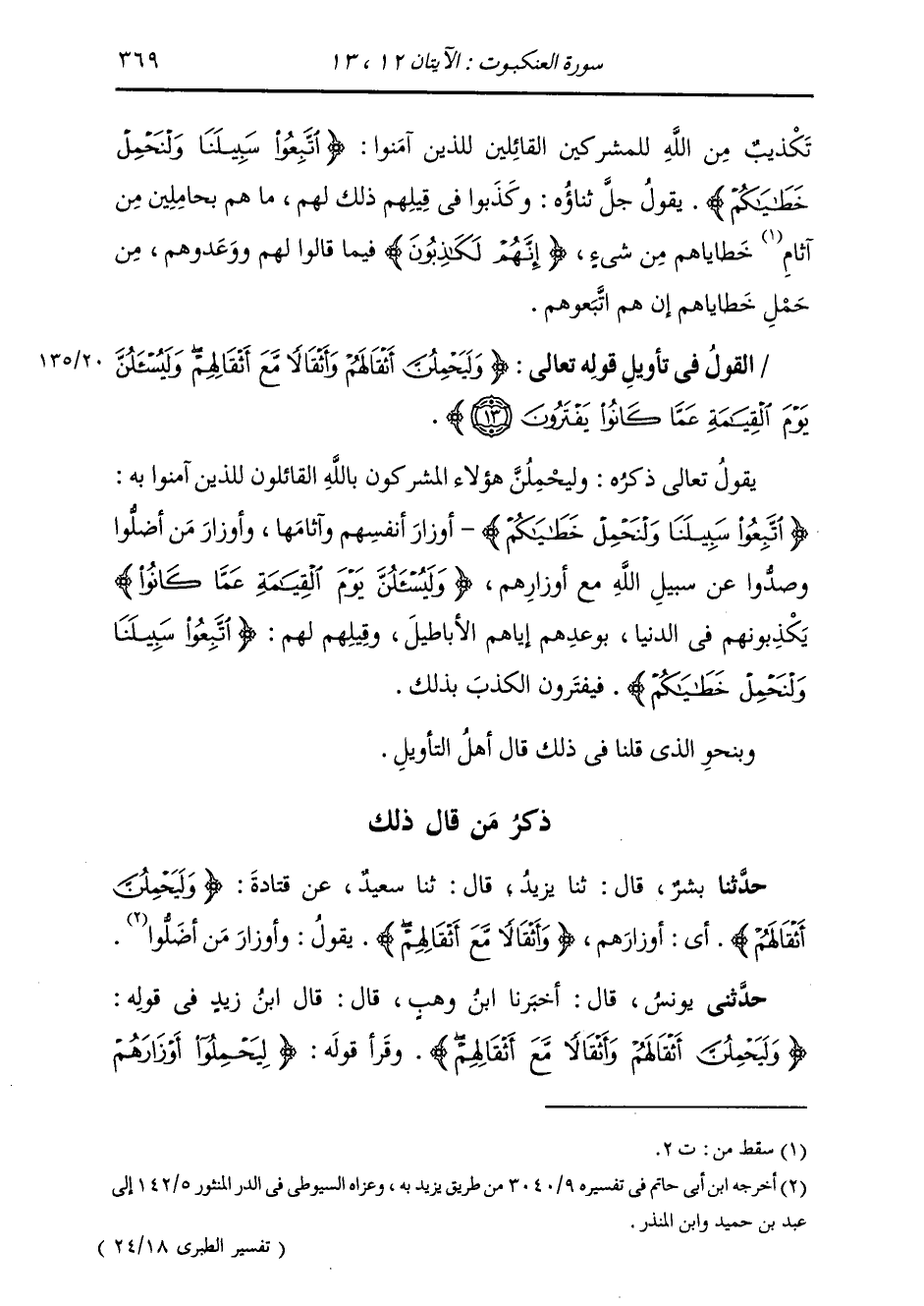 §الْقَوْلُ فِي تَأْوِيلِ قَوْلِهِ تَعَالَى: {وَلَيَحْمِلُنَّ أَثْقَالَهُمْ وَأَثْقَالًا مَعَ أَثْقَالِهِمْ، وَلَيُسْأَلُنَّ يَوْمَ الْقِيَامَةِ عَمَّا كَانُوا يَفْتَرُونَ} [العنكبوت: 13] يَقُولُ تَعَالَى ذِكْرُهُ: وَلَيَحْمِلُنَّ هَؤُلَاءِ الْمُشْرِكُونَ بِاللَّهِ الْقَائِلُونَ لِلَّذِينَ آمَنُوا بِهِ اتَّبِعُوا سَبِيلَنَا وَلْنَحْمِلْ خَطَايَاكُمْ أَوْزَارَ أَنْفُسِهِمْ وَآثَامَهَا، وَأَوْزَارَ مَنْ أَضَلُّوا وَصَدُّوا عَنْ سَبِيلِ اللَّهِ مَعَ أَوْزَارِهِمْ، وَلَيُسْئَلُنَّ يَوْمَ الْقِيَامَةِ عَمَّا كَانُوا يُكَذِّبُونَهُمْ فِي الدُّنْيَا بِوَعْدِهِمْ إِيَّاهُمُ الْأَبَاطِيلَ، وَقِيلِهِمْ لَهُمُ: اتَّبِعُوا سَبِيلَنَا وَلْنَحْمِلْ خَطَايَاكُمْ فَيَفْتَرُونَ الْكَذِبَ بِذَلِكَ. وَبِنَحْوِ الَّذِي قُلْنَا فِي ذَلِكَ قَالَ أَهْلُ التَّأْوِيلِ.