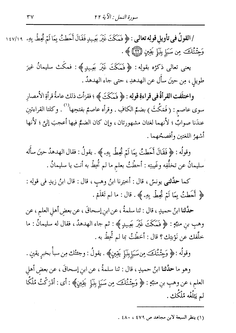 §الْقَوْلُ فِي تَأْوِيلِ قَوْلِهِ تَعَالَى: {فَمَكَثَ غَيْرَ بَعِيدٍ فَقَالَ أَحَطْتُ بِمَا لَمْ تُحِطْ بِهِ، وَجِئْتُكَ مِنْ سَبَإٍ بِنَبَإٍ يَقِينٍ} [النمل: 22] يَعْنِي تَعَالَى ذِكْرُهُ بِقَوْلِهِ: {فَمَكَثَ غَيْرَ بَعِيدٍ} [النمل: 22] فَمَكَثَ سُلَيْمَانُ غَيْرَ طَوِيلٍ مِنْ حِينَ سَأَلَ عَنِ الْهُدْهُدِ، حَتَّى جَاءَ الْهُدْهُدُ. وَاخْتَلَفَ الْقُرَّاءُ فِي قِرَاءَةِ قَوْلِهِ: {فَمَكَثَ} [النمل: 22] فَقَرَأَتْ ذَلِكَ عَامَّةُ قُرَّاءِ الْأَمْصَارِ سِوَى عَاصِمٍ: (فَمَكُثَ) ، بِضَمُّ الْكَافِ، وَقَرَأَهُ عَاصِمٌ بِفَتْحِهَا، وَكِلْتَا الْقِرَاءَتَيْنِ عِنْدَنَا صَوَابٌ، لِأَنَّهُمَا لُغَتَانِ مَشْهُورَتَانِ، وَإِنْ كَانَ الضَّمُّ فِيهَا أَعْجَبُ إِلَيَّ، لِأَنَّهَا أَشْهُرُ اللُّغَتَيْنِ وَأَفْصَحُهُمَا