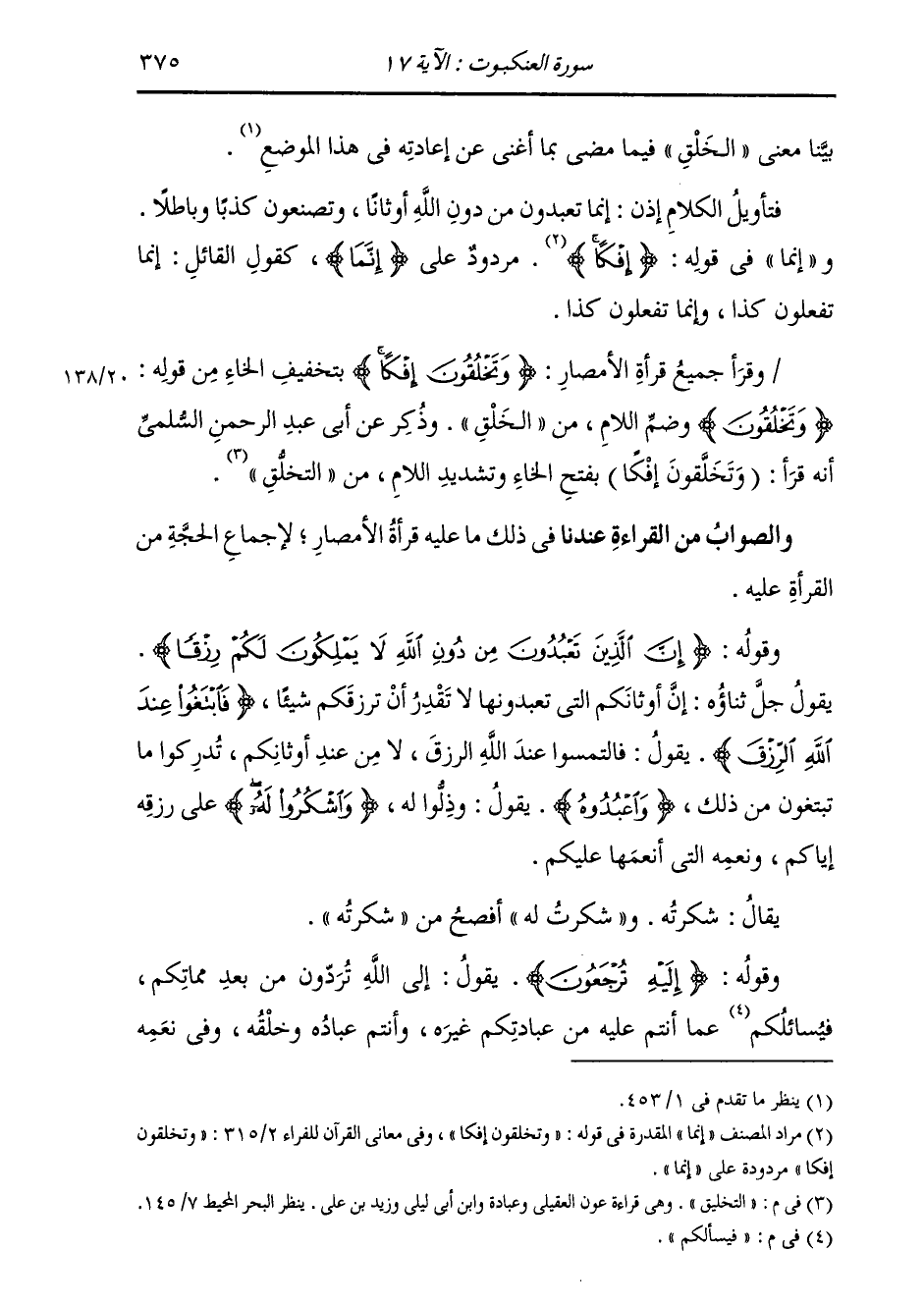بَيَّنَّا مَعْنَى الْخَلْقِ فِيمَا مَضَى , بِمَا أَغْنَى عَنْ إِعَادَتِهِ فِي هَذَا الْمَوْضِعِ. فَتَأْوِيلُ الْكَلَامِ إِذَنْ: إِنَّمَا تَعْبُدُونَ مِنْ دُونِ اللَّهِ أَوْثَانًا، وَتَصْنَعُونَ كَذِبًا وَبَاطِلًا. وَإِنَّمَا فِي قَوْلِهِ {إِفْكًا} [العنكبوت: 17] مَرْدُودٌ عَلَى إِنَّمَا، كَقَوْلِ الْقَائِلِ: إِنَّمَا تَفْعَلُونَ كَذَا، وَإِنَّمَا تَفْعَلُونَ كَذَا. وَقَرَأَ جَمِيعُ قُرَّاءِ الْأَمْصَارِ: {وَتَخْلُقُونَ إِفْكًا} [العنكبوت: 17] بِتَخْفِيفِ الْخَاءِ مِنْ قَوْلِهِ: {وَتَخْلُقُونَ} [العنكبوت: 17] وَضَمِّ اللَّامِ مِنَ الْخَلْقِ. وَذُكِرَ عَنْ أَبِي عَبْدِ الرَّحْمَنِ السُّلَمِيِّ أَنَّهُ قَرَأَ: «وَتُخَلِّقُونَ إِفْكًا» بِفَتْحِ الْخَاءِ , وَتَشْدِيدِ اللَّامِ مِنَ التَّخْلِيقِ. وَالصَّوَابُ مِنَ الْقِرَاءَةِ فِي ذَلِكَ عِنْدَنَا مَا عَلَيْهِ قُرَّاءُ الْأَمْصَارِ، لِإِجْمَاعِ الْحُجَّةِ مِنَ الْقُرَّاءِ عَلَيْهِ.