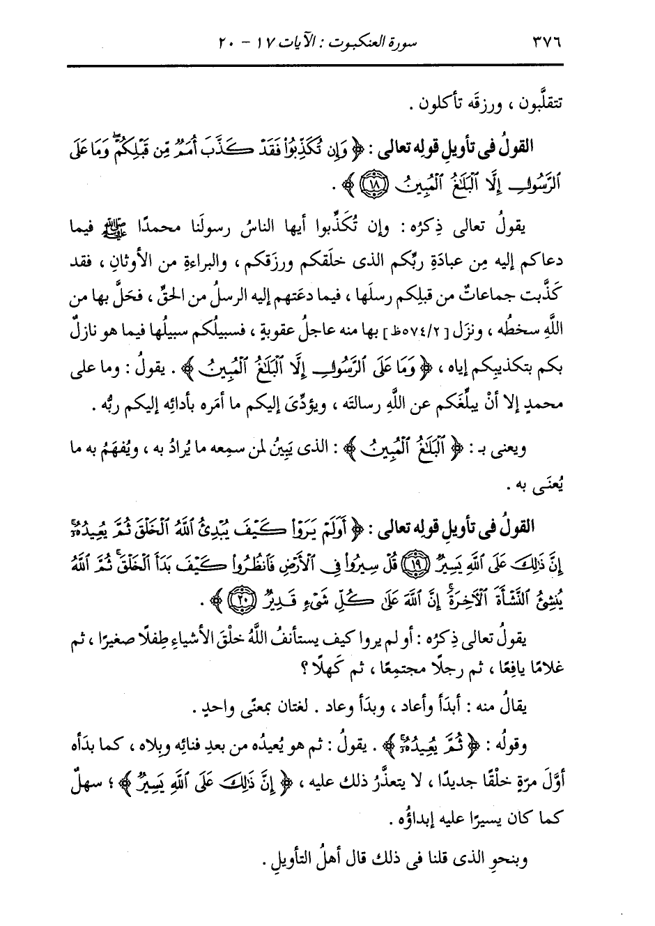§الْقَوْلُ فِي تَأْوِيلِ قَوْلِهِ تَعَالَى: {أَوَلَمْ يَرَوْا كَيْفَ يُبْدِئُ اللَّهُ الْخَلْقَ ثُمَّ يُعِيدُهُ} [العنكبوت: 19] يَقُولُ تَعَالَى ذِكْرُهُ: أَوَ لَمْ يَرَوْا كَيْفَ يَسْتَأْنِفُ اللَّهُ خَلْقَ الْأَشْيَاءِ طِفْلًا صَغِيرًا، ثُمَّ غُلَامًا يَافِعًا، ثُمَّ رَجُلًا مُجْتَمِعًا، ثُمَّ كَهْلًا. يُقَالُ مِنْهُ: أَبْدَأَ وَأَعَادَ، وَبَدَأَ وَعَادَ، لُغَتَانِ بِمَعْنًى وَاحِدٍ.