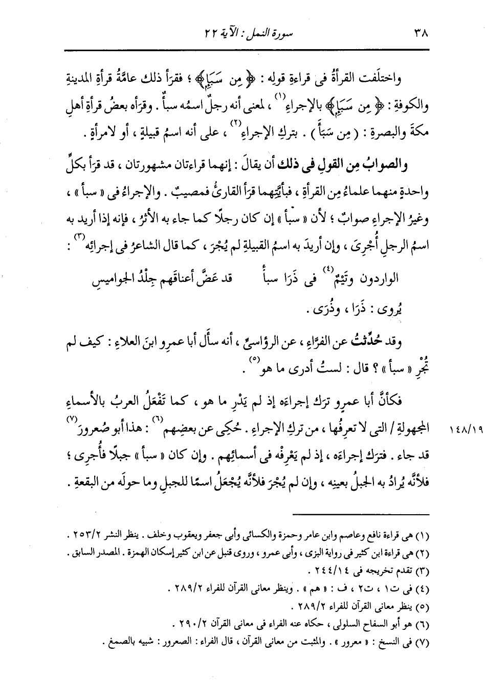 وَاخْتَلَفَتِ الْقُرَّاءِ فِي قِرَاءَةِ قَوْلِهِ: {مِنْ سَبَإٍ} [النمل: 22] فَقَرَأَ ذَلِكَ عَامَّةُ قُرَّاءِ الْمَدِينَةِ وَالْكُوفَةِ {مِنْ سَبَإٍ} [النمل: 22] ، بِالْإِجْرَاءِ. الْمَعْنَى أَنَّهُ رَجُلٌ اسْمُهُ سَبَأٌ. وَقَرَأَهُ بَعْضُ قُرَّاءِ أَهْلِ مَكَّةَ وَالْبَصْرَةَ (مِنْ سَبَأَ) ، بِتَرْكِ الْإِجْرَاءِ، عَلَى أَنَّهُ اسْمُ قَبِيلَةٍ أَوْ لِامْرَأَةٍ. وَالصَّوَابُ مِنَ الْقَوْلِ فِي ذَلِكَ أَنْ يُقَالَ: إِنَّهُمَا قِرَاءَتَانِ مَشْهُورَتَانِ، وَقَدْ قَرَأَ بِكُلِّ وَاحِدَةٍ مِنْهُمَا عُلَمَاءُ مِنَ الْقُرَّاءِ، فَبِأَيَّتِهِمَا قَرَأَ الْقَارِئُ فَمُصِيبٌ؛ فَالْإِجْرَاءُ فِي سَبَإٍ وَغَيْرُ الْإِجْرَاءِ صَوَابٌ، لِأَنَّ سَبَأَ إِنْ كَانَ رَجُلًا كَمَا جَاءَ بِهِ الْأَثَرُ، فَإِنَّهُ إِذَا أُرِيدَ بِهِ اسْمُ الرَّجُلِ أُجْرِيَ، وَإِنْ أُرِيدَ بِهِ اسْمُ الْقَبِيلَةِ لَمْ يُجْرَ، كَمَا قَالَ الشَّاعِرُ فِي إِجْرَائِهِ: