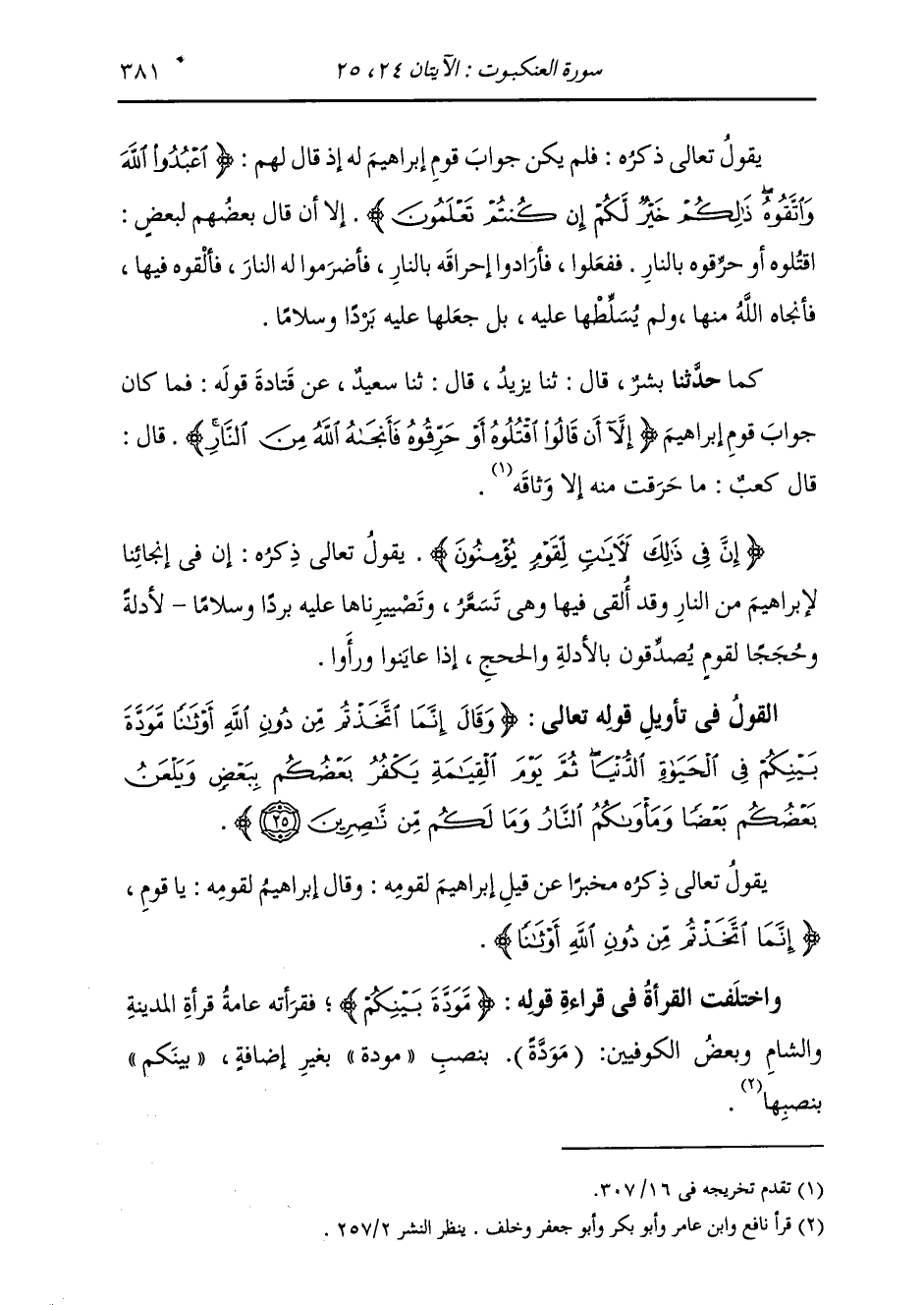 §الْقَوْلُ فِي تَأْوِيلِ قَوْلِهِ تَعَالَى: {وَقَالَ إِنَّمَا اتَّخَذْتُمْ مِنْ دُونِ اللَّهِ أَوْثَانًا مَوَدَّةَ بَيْنِكُمْ فِي الْحَيَاةِ الدُّنْيَا} [العنكبوت: 25] يَقُولُ تَعَالَى ذِكْرُهُ مُخْبِرًا عَنْ قِيلِ إِبْرَاهِيمَ لِقَوْمِهِ: {وَقَالَ} [البقرة: 118] إِبْرَاهِيمُ لِقَوْمِهِ: يَا قَوْمِ {إِنَّمَا اتَّخَذْتُمْ مِنْ دُونِ اللَّهِ أَوْثَانًا} [العنكبوت: 25] وَاخْتَلَفَتِ الْقُرَّاءُ فِي قِرَاءَةِ قَوْلِهِ: {مَوَدَّةَ بَيْنِكُمْ} [العنكبوت: 25] فَقَرَأَتْهُ عَامَّةُ قُرَّاءِ الْمَدِينَةِ وَالشَّأْمِ وَبَعْضُ الْكُوفِيِّينَ: (مَوَدَّةً) بِنَصْبِ مَوَدَّةٍ بِغَيْرِ إِضَافَةِ {بَيْنِكُمْ} [البقرة: 188] بِنَصْبِهَا.