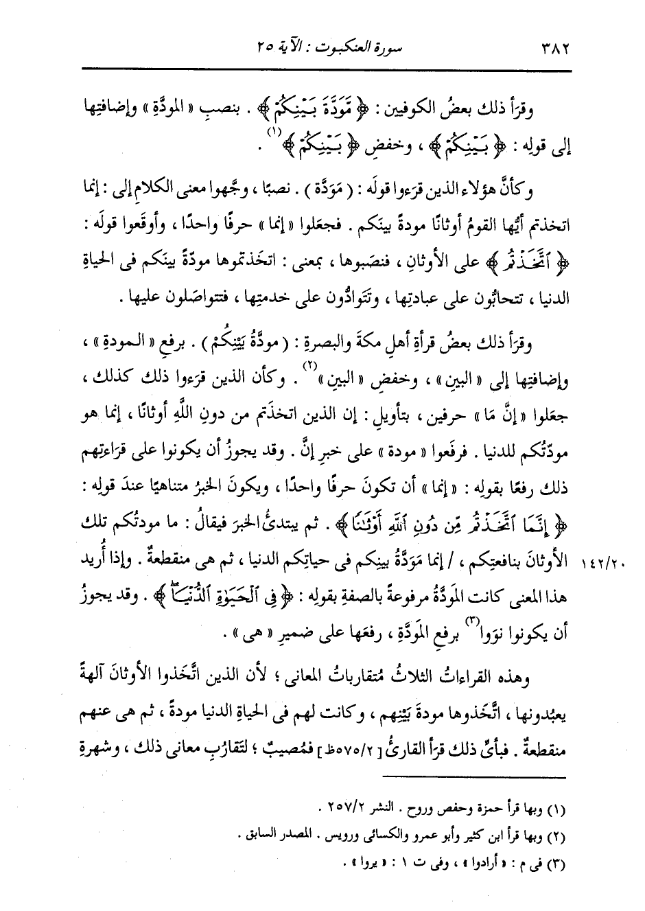 وَقَرَأَ ذَلِكَ بَعْضُ الْكُوفِيِّينَ: {مَوَدَّةَ بَيْنِكُمْ} [العنكبوت: 25] بِنَصْبِ الْمَوَدَّةِ , وَإِضَافَتِهَا إِلَى قَوْلِهِ {بَيْنِكُمْ} [البقرة: 188] وَخَفْضِ {بَيْنِكُمْ} [البقرة: 188] . وَكَأَنَّ هَؤُلَاءِ الَّذِينَ قَرَءُوا قَوْلَهُ: {مَوَدَّةَ} [النساء: 73] نَصْبًا وَجَّهُوا مَعْنَى الْكَلَامِ إِلَى: إِنَّمَا اتَّخَذْتُمْ أَيُّهَا الْقَوْمُ أَوْثَانًا مَوَدَّةً بَيْنَكُمْ، فَجَعَلُوا إِنَّمَا حَرْفًا وَاحِدًا، وَأَوْقَعُوا قَوْلَهُ {اتَّخَذْتُمْ} [البقرة: 51] عَلَى الْأَوْثَانِ، فَنَصَبُوهَا بِمَعْنَى: اتَّخَذْتُمُوهَا مَوَدَّةً بَيْنَكُمْ فِي الْحَيَاةِ الدُّنْيَا، تَتَحَابُّونَ عَلَى عِبَادَتِهَا، وَتَتَوَادُّونَ عَلَى خِدْمَتِهَا، فَتَتَوَاصَلُونَ عَلَيْهَا. وَقَرَأَ ذَلِكَ بَعْضُ قُرَّاءِ أَهْلِ مَكَّةَ وَالْبَصْرَةَ: (مَوَدَّةُ بَيْنِكُمْ) بِرَفْعِ الْمَوَدَّةِ , وَإِضَافَتِهَا إِلَى الْبَيْنِ، وَخَفْضِ الْبَيْنِ. وَكَأَنَّ الَّذِينَ قَرَءُوا ذَلِكَ كَذَلِكَ، جَعَلُوا إِنَّمَا حَرْفَيْنِ، بِتَأْوِيلِ: إِنَّ الَّذِينَ اتَّخَذْتُمْ مِنْ دُونِ اللَّهِ أَوْثَانًا إِنَّمَا هُوَ مَوَدَّتُكُمْ لِلدُّنْيَا، فَرَفَعُوا مَوَدَّةَ عَلَى خَبَرِ إِنَّ. وَقَدْ يَجُوزُ أَنْ يَكُونُوا عَلَى قِرَاءَتِهِمْ ذَلِكَ رَفْعًا بِقَوْلِهِ {إِنَّمَا} [البقرة: 11] أَنْ تَكُونَ حَرْفًا وَاحِدًا، وَيَكُونَ الْخَبَرُ مُتَنَاهِيًا عِنْدَ قَوْلِهِ {إِنَّمَا اتَّخَذْتُمْ مِنْ دُونِ اللَّهِ أَوْثَانًا} [العنكبوت: 25] ثُمَّ يَبْتَدِئُ الْخَبَرَ فَيُقَالُ: مَا مَوَدَّتُكُمْ تِلْكَ الْأَوْثَانَ بِنَافِعَتِكُمْ، إِنَّمَا مَوَدَّةُ بَيْنِكُمْ فِي حَيَاتِكُمُ الدُّنْيَا، ثُمَّ هِيَ مُنْقَطِعَةٌ، وَإِذَا أُرِيدَ هَذَا الْمَعْنَى كَانَتِ الْمَوَدَّةُ مَرْفُوعَةً بِالصِّفَةِ بِقَوْلِهِ {فِي الْحَيَاةِ الدُّنْيَا} [البقرة: 85] وَقَدْ يَجُوزُ أَنْ يَكُونُوا أَرَادُوا بِرَفْعِ الْمَوَدَّةِ، رَفْعَهَا عَلَى ضَمِيرِ هِيَ. وَهَذِهِ الْقِرَاءَاتُ الثَّلَاثُ مُتَقَارِبَاتُ الْمَعَانِي، لِأَنَّ الَّذِينَ اتَّخَذُوا الْأَوْثَانَ آلِهَةً يَعْبُدُونَهَا، اتَّخَذُوهَا مَوَدَّةً بَيْنَهُمْ، وَكَانَتْ لَهُمْ فِي الْحَيَاةِ الدُّنْيَا مَوَدَّةً، ثُمَّ هِيَ عَنْهُمْ مُنْقَطِعَةٌ، فَبِأَيِّ ذَلِكَ قَرَأَ الْقَارِئُ فَمُصِيبٌ، لِتَقَارُبِ مُعَانِي ذَلِكَ، وَشُهْرَةِ