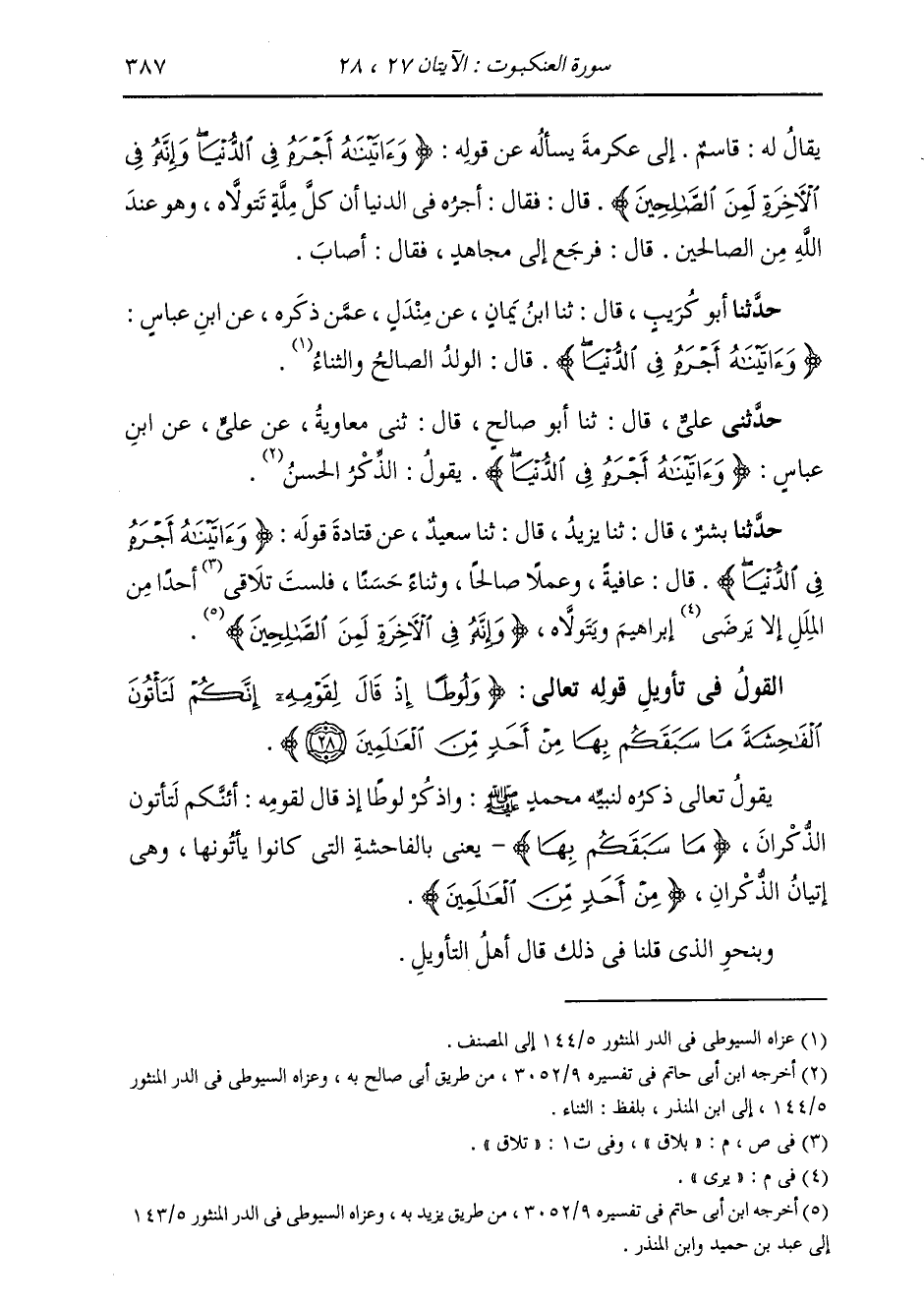 حَدَّثَنِي عَلِيٌّ، قَالَ: ثنا أَبُو صَالِحٍ، قَالَ: ثني مُعَاوِيَةُ، عَنْ عَلِيٍّ، عَنِ ابْنِ عَبَّاسٍ، " {§وَآتَيْنَاهُ أَجْرَهُ فِي الدُّنْيَا} [العنكبوت: 27] يَقُولُ: الذِّكْرُ الْحَسَنُ "