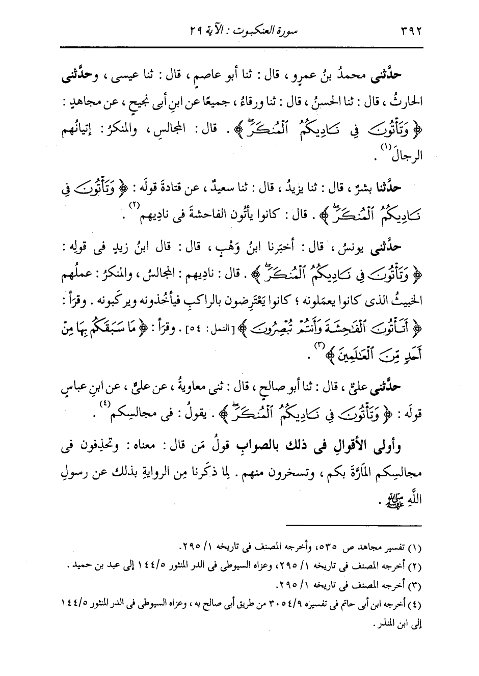 حَدَّثَنِي يُونُسُ، قَالَ: أَخْبَرَنَا ابْنُ وَهْبٍ، قَالَ: قَالَ ابْنُ زَيْدٍ، فِي قَوْلِهِ " {§وَتَأْتُونَ فِي نَادِيكُمُ الْمُنْكَرَ} [العنكبوت: 29] قَالَ: نَادِيهُمُ: الْمَجَالِسُ، وَالْمُنْكَرُ: عَمَلُهُمُ الْخَبِيثُ الَّذِي كَانُوا يَعْمَلُونَهُ، كَانُوا يَعْتَرِضُونَ بِالرَّاكِبِ , فَيَأْخُذُونَهُ وَيَرْكَبُونَهُ. وَقَرَأَ {أَتَأْتُونَ الْفَاحِشَةَ وَأَنْتُمْ تُبْصِرُونَ} [النمل: 54] , وَقَرَأَ {مَا سَبَقَكُمْ بِهَا مِنْ أَحَدٍ مِنَ الْعَالَمِينَ} [الأعراف: 80] "