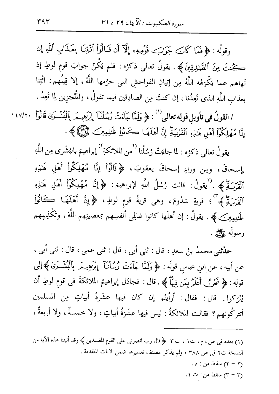 حَدَّثَنِي مُحَمَّدُ بْنُ سَعْدٍ، قَالَ: ثني أَبِي، قَالَ: ثني عَمِّي، قَالَ: ثني أَبِي، عَنْ أَبِيهِ، عَنِ ابْنِ عَبَّاسٍ، قَوْلُهُ " {§وَلَمَّا جَاءَتْ رُسُلُنَا إِبْرَاهِيمَ بِالْبُشْرَى} [العنكبوت: 31] إِلَى قَوْلِهِ {نَحْنُ أَعْلَمُ بِمَنْ فِيهَا} [العنكبوت: 32] قَالَ: فَجَادَلَ إِبْرَاهِيمُ الْمَلَائِكَةَ فِي قَوْمِ لُوطٍ أَنْ يُتْرَكُوا، قَالَ: فَقَالَ: أَرَأَيْتُمْ إِنْ كَانَ فِيهَا عَشَرَةُ أَبْيَاتٍ مِنَ الْمُسْلِمِينَ , أَتَتْرُكُونَهُمْ؟ فَقَالَتِ الْمَلَائِكَةُ: لَيْسَ فِيهَا عَشَرَةُ أَبْيَاتٍ، وَلَا خَمْسَةٍ، وَلَا أَرْبَعَةٍ، -[394]- وَلَا ثَلَاثَةٍ، وَلَا اثْنَانِ؛ قَالَ: فَحَزِنَ عَلَى لُوطٍ وَأَهْلِ بَيْتِهِ، فَقَالَ {إِنَّ فِيهَا لُوطًا قَالُوا نَحْنُ أَعْلَمُ بِمَنْ فِيهَا، لَنُنَجِّيَنَّهُ وَأَهْلَهُ إِلَّا امْرَأَتَهُ كَانَتْ مِنَ الْغَابِرِينَ} [العنكبوت: 32] فَذَلِكَ قَوْلُهُ: {يُجَادِلُنَا فِي قَوْمِ لُوطٍ، إِنَّ إِبْرَاهِيمَ لَحَلِيمٌ أَوَّاهٌ مُنِيبٌ} [هود: 75] , فَقَالَتِ الْمَلَائِكَةُ: {يَا إِبْرَاهِيمُ أَعْرِضْ عَنْ هَذَا، إِنَّهُ قَدْ جَاءَ أَمْرُ رَبِّكَ، وَإِنَّهُمْ آتِيهِمْ عَذَابٌ غَيْرُ مَرْدُودٍ} [هود: 76] فَبَعَثَ اللَّهُ إِلَيْهِمْ جِبْرَائِيلَ صَلَّى اللهُ عَلَيْهِ وَسَلَّمَ، فَانْتَسَفَ الْمَدِينَةَ وَمَا فِيهَا بِأَحَدِ جَنَاحَيْهِ، فَجَعَلَ عَالِيَهَا سَافِلَهَا، وَتَتَبَّعَهُمْ بِالْحِجَارَةِ بِكُلِّ أَرْضٍ "