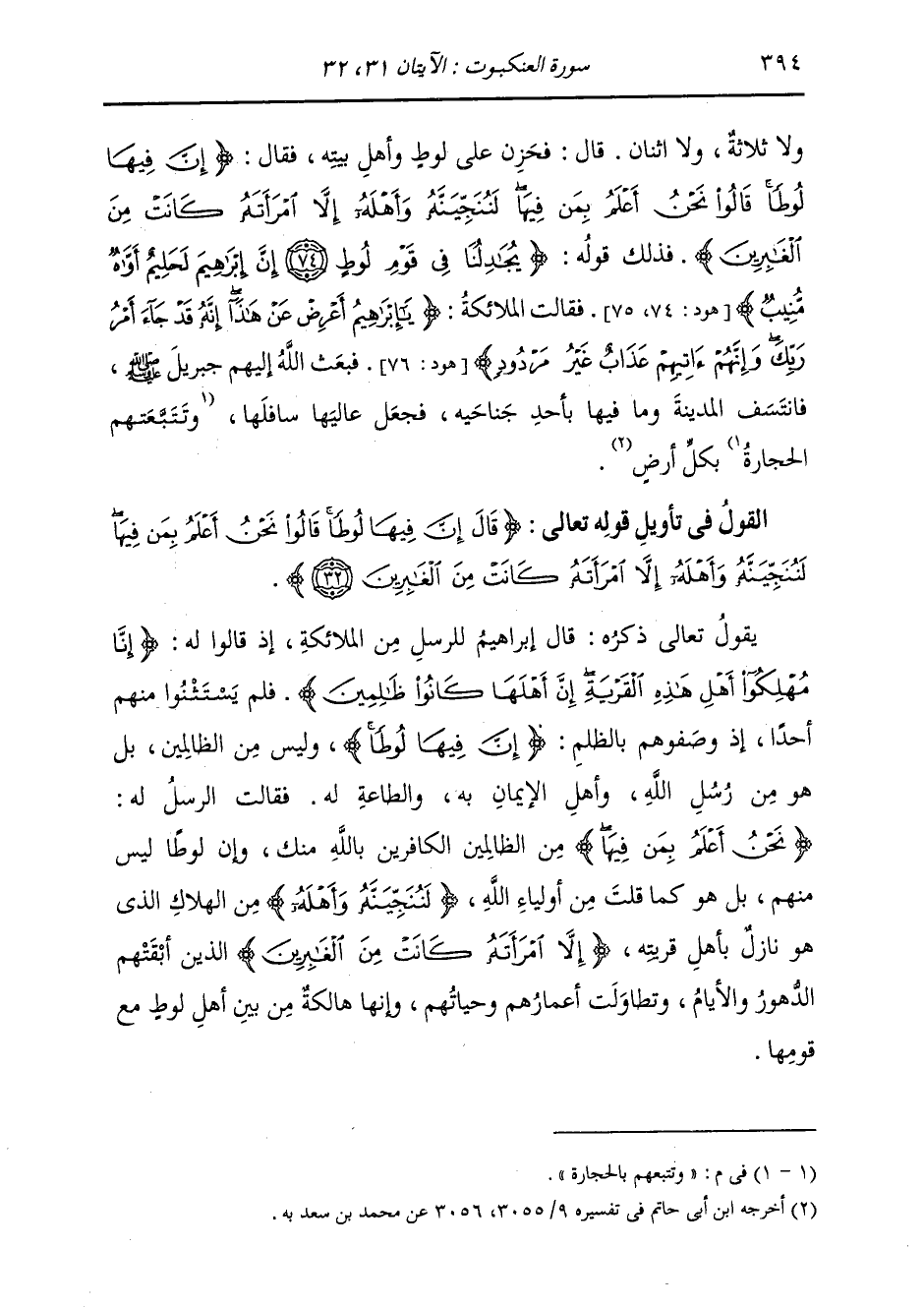 §الْقَوْلُ فِي تَأْوِيلِ قَوْلِهِ تَعَالَى: {قَالَ إِنَّ فِيهَا لُوطًا، قَالُوا نَحْنُ أَعْلَمُ بِمَنْ فِيهَا، لَنُنَجِّيَنَّهُ وَأَهْلَهُ إِلَّا امْرَأَتَهُ كَانَتْ مِنَ الْغَابِرِينَ} [العنكبوت: 32] يَقُولُ تَعَالَى ذِكْرُهُ: قَالَ إِبْرَاهِيمُ لِلرُّسُلِ مِنَ الْمَلَائِكَةِ، إِذْ قَالُوا لَهُ: {إِنَّا مُهْلِكُو أَهْلِ هَذِهِ الْقَرْيَةِ، إِنَّ أَهْلَهَا كَانُوا ظَالِمِينَ} [العنكبوت: 31] فَلَمْ يَسْتَثْنُوا مِنْهُمْ أَحَدًا، إِذْ وَصَفُوهُمْ بِالظُّلْمِ: إِنَّ فِيهَا لُوطًا، وَلَيْسَ مِنَ الظَّالِمِينَ، بَلْ هُوَ مِنْ رُسُلِ اللَّهِ، وَأَهْلِ الْإِيمَانِ بِهِ، وَالطَّاعَةِ لَهُ، فَقَالَتِ الرُّسُلُ لَهُ: {نَحْنُ أَعْلَمُ بِمَنْ فِيهَا} [العنكبوت: 32] مِنَ الظَّالِمِينَ الْكَافِرِينَ بِاللَّهِ مِنْكَ، وَإِنَّ لُوطًا لَيْسَ مِنْهُمْ، بَلْ هُوَ كَمَا قُلْتَ مِنْ أَوْلِيَاءِ اللَّهِ، لَنُنَجِّيَنَّهُ وَأَهْلَهُ مِنَ الْهَلَاكِ الَّذِي هُوَ نَازِلٌ بِأَهْلِ قَرْيَتِهِ {إِلَّا امْرَأَتَهُ كَانَتْ مِنَ الْغَابِرِينَ} [الأعراف: 83] الَّذِينَ أَبْقَتْهُمُ الدُّهُورُ وَالْأَيَّامُ، وَتَطَاوَلَتْ أَعْمَارُهُمْ وَحَيَاتُهُمْ، وَإِنَّهَا هَالِكَةٌ مِنْ بَيْنِ أَهْلِ لُوطٍ مَعَ قَوْمِهَا.