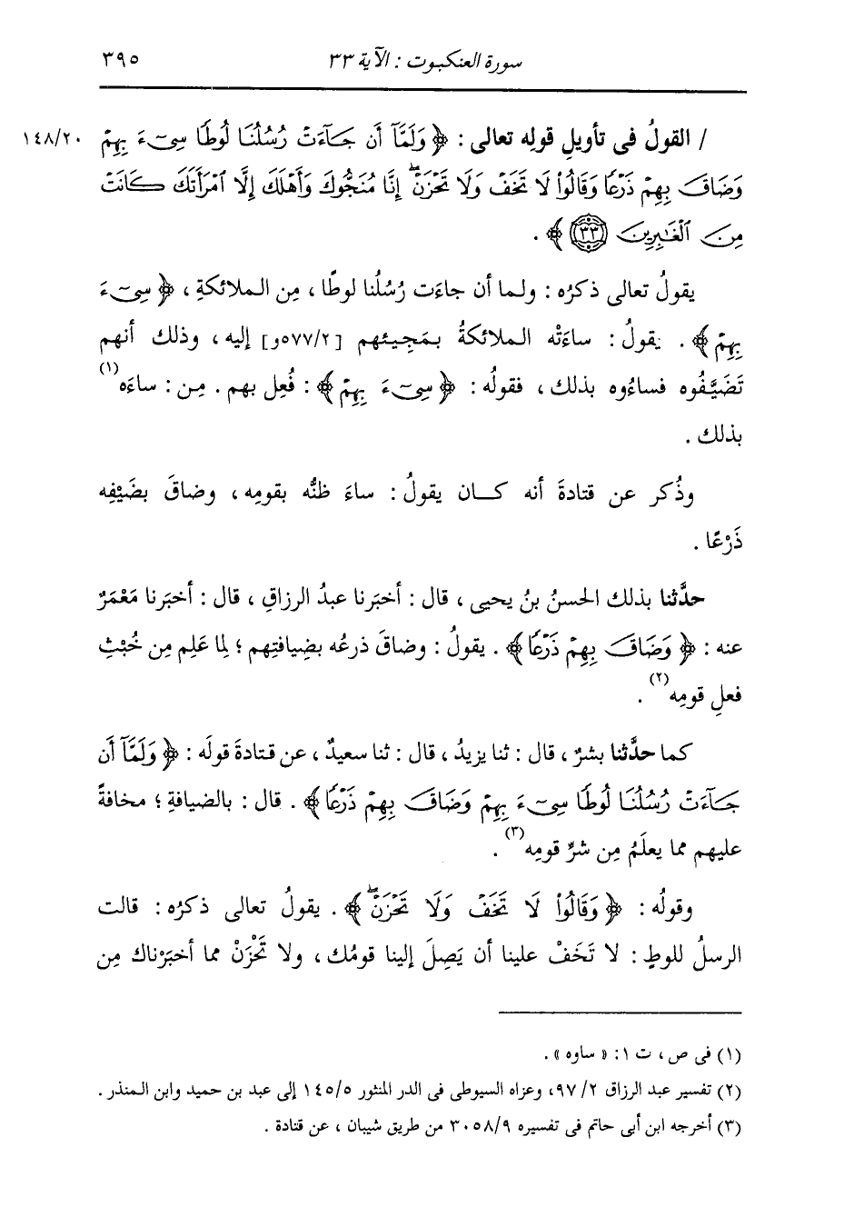§الْقَوْلُ فِي تَأْوِيلِ قَوْلِهِ تَعَالَى: {وَلَمَّا أَنْ جَاءَتْ رُسُلُنَا لُوطًا سِيءَ بِهِمْ وَضَاقَ بِهِمْ ذَرْعًا} [العنكبوت: 33] يَقُولُ تَعَالَى ذِكْرُهُ: {وَلَمَّا أَنْ جَاءَتْ رُسُلُنَا لُوطًا} [العنكبوت: 33] مِنَ الْمَلَائِكَةِ {سِيءَ بِهِمْ} [هود: 77] يَقُولُ: سَاءَتْهُ الْمَلَائِكَةُ بِمَجِيئِهِمْ إِلَيْهِ، وَذَلِكَ أَنَّهُمْ تَضَيَّفُوهُ، فَسَاءَهُ بِذَلِكَ، فَقَوْلُهُ {سِيءَ بِهِمْ} [هود: 77] فَعَلَ بِهِمْ مَنْ سَاءَهُ بِذَلِكَ. وَذُكِرَ عَنْ قَتَادَةَ كَانَ يَقُولُ: سَاءَ ظَنُّهُ بِقَوْمِهِ، وَضَاقَ بِضَيْفِهِ ذَرْعًا.