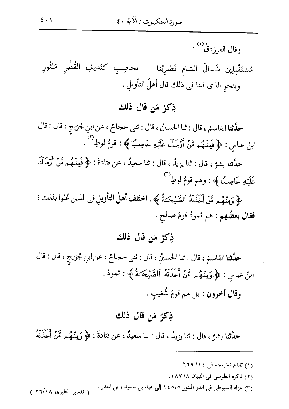 ذِكْرُ مَنْ قَالَ ذَلِكَ: حَدَّثَنَا الْقَاسِمُ، قَالَ: ثنا الْحُسَيْنُ، قَالَ: ثني حَجَّاجٌ، عَنِ ابْنِ جُرَيْجٍ، قَالَ: قَالَ ابْنُ عَبَّاسٍ، " {§وَمِنْهُمْ مَنْ أَخَذَتْهُ الصَّيْحَةُ} [العنكبوت: 40] ثَمُودُ ". وَقَالَ آخَرُونَ: بَلْ هُمْ قَوْمُ شُعَيْبٍ.