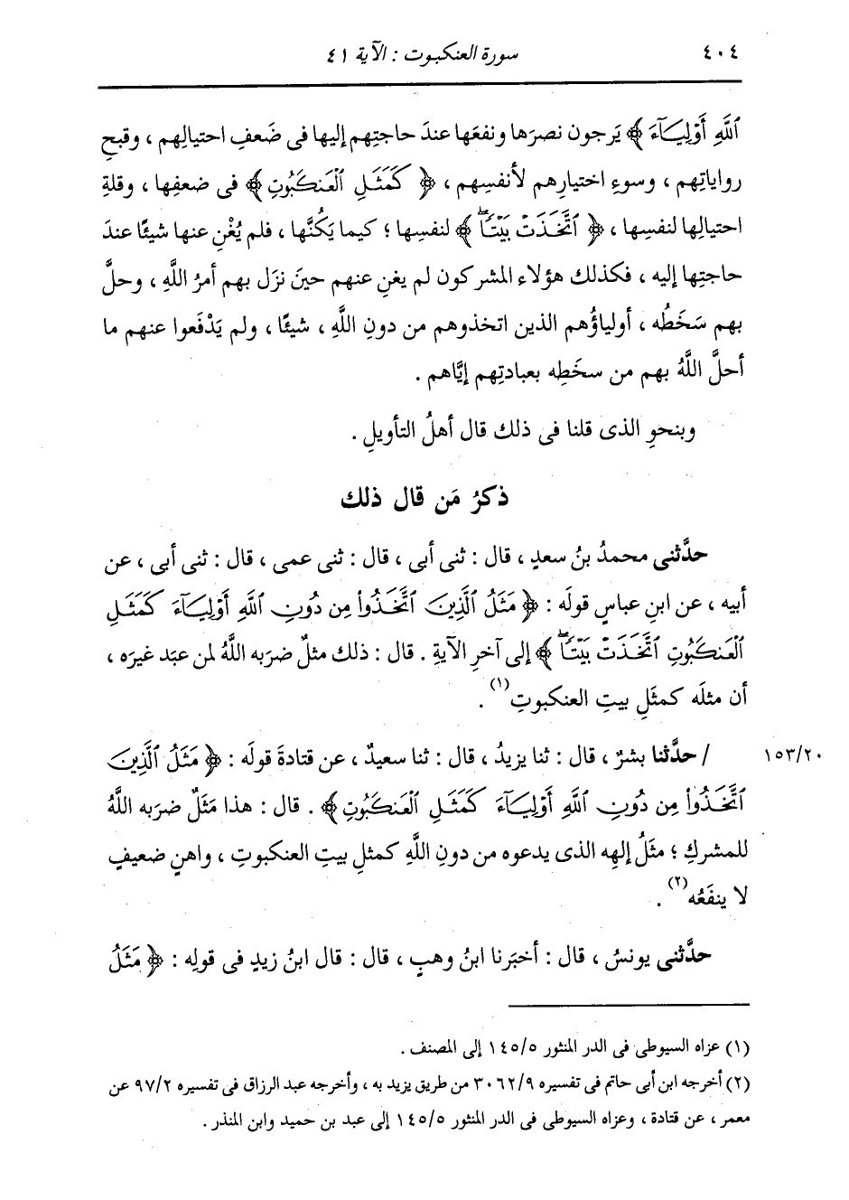 ذِكْرُ مَنْ قَالَ ذَلِكَ: حَدَّثَنِي مُحَمَّدُ بْنُ سَعْدٍ، قَالَ: ثني أَبِي، قَالَ: ثني عَمِّي، قَالَ: ثني أَبِي، عَنْ أَبِيهِ، عَنِ ابْنِ عَبَّاسٍ، قَوْلُهُ " {§مَثَلُ الَّذِينَ اتَّخَذُوا مِنْ دُونِ اللَّهِ أَوْلِيَاءَ كَمَثَلِ الْعَنْكَبُوتِ اتَّخَذَتْ بَيْتًا} [العنكبوت: 41] إِلَى آخِرِ الْآيَةِ، قَالَ: ذَلِكَ مَثَلٌ ضَرَبَهُ اللَّهُ لِمَنْ عَبَدَ غَيْرَهُ، إِنَّ مَثَلَهُ كَمَثَلِ بَيْتِ الْعَنْكَبُوتِ "
