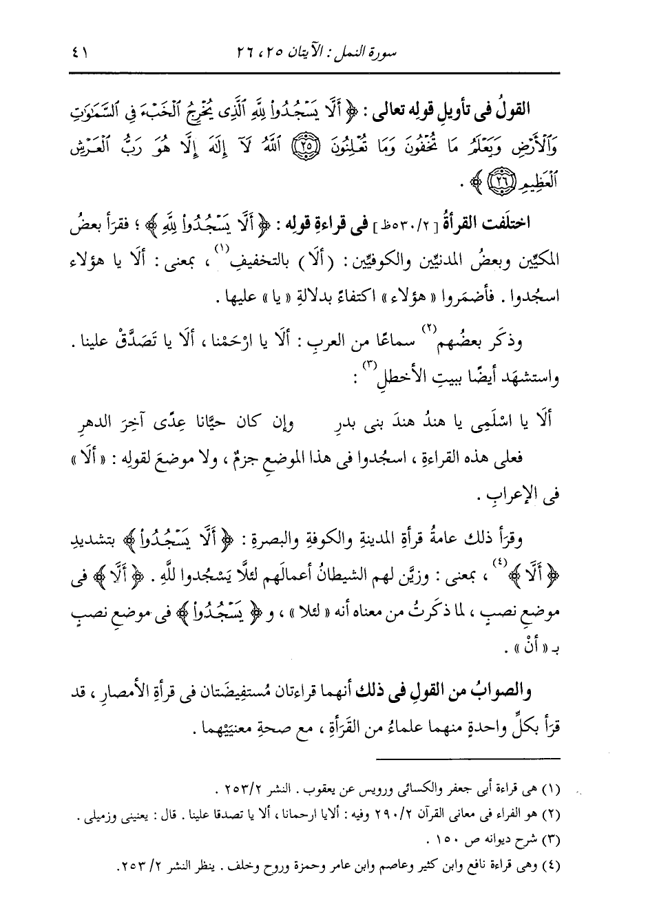 §الْقَوْلُ فِي تَأْوِيلِ قَوْلِهِ تَعَالَى: {أَلَّا يَسْجُدُوا لِلَّهِ الَّذِي يُخْرِجُ الْخَبْءَ فِي السَّمَوَاتِ وَالْأَرْضِ وَيَعْلَمُ مَا تُخْفُونَ وَمَا تُعْلِنُونَ اللَّهُ لَا إِلَهَ إِلَّا هُوَ رَبُّ الْعَرْشِ الْعَظِيمِ} اخْتَلَفَ الْقُرَّاءُ، فِي قِرَاءَةِ قَوْلِهِ {أَلَّا يَسْجُدُوا لِلَّهِ} [النمل: 25] فَقَرَأَ بَعْضُ الْمَكِّيِّينَ وَبَعْضُ الْمَدَنِيِّينَ وَالْكُوفِيِّينَ (أَلَا) ، بِالتَّخْفِيفِ، بِمَعْنَى: أَلَا يَا هَؤُلَاءِ اسْجُدُوا، فَأَضْمَرُوا «هَؤُلَاءِ» اكْتِفَاءً بِدَلَالَةِ «يَا» عَلَيْهَا. وَذَكَرَ بَعْضُهُمْ سَمَاعًا مِنَ الْعَرَبِ: أَلَا يَا ارْحَمْنَا، أَلَا يَا تَصَدَّقْ عَلَيْنَا؛ وَاسْتُشْهِدَ أَيْضًا بِبَيْتِ الْأَخْطَلِ:
