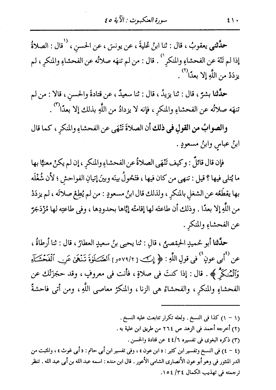 حَدَّثَنَا أَبُو حُمَيْدٍ الْحِمْصِيُّ، قَالَ: ثنا يَحْيَى بْنُ سَعِيدٍ الْعَطَّارُ، قَالَ: ثنا أَرْطَأَةُ، عَنِ ابْنِ عَوْنٍ، فِي قَوْلِ اللَّهِ " {§إِنَّ الصَّلَاةَ تَنْهَى عَنِ الْفَحْشَاءِ وَالْمُنْكَرِ} [العنكبوت: 45] قَالَ: إِذَا كُنْتَ فِي صَلَاةٍ، فَأَنْتَ فِي مَعْرُوفٍ، وَقَدْ حَجَزَتْكَ عَنِ الْفَحْشَاءِ وَالْمُنْكَرِ، وَالْفَحْشَاءُ: هُوَ الزِّنَا وَالْمُنْكَرُ: مَعَاصِي اللَّهِ، وَمَنْ أَتَى فَاحِشَةً -[411]- أَوْ عَصَى اللَّهَ فِي صَلَاتِهِ بِمَا يُفْسِدُ صَلَاتَهُ، فَلَا شَكَّ أَنَّهُ لَا صَلَاةَ لَهُ "