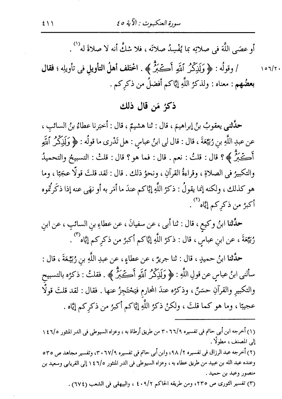 ذِكْرُ مَنْ قَالَ ذَلِكَ: حَدَّثَنِي يَعْقُوبُ بْنُ إِبْرَاهِيمَ، قَالَ: ثنا هُشَيْمٌ، قَالَ: أَخْبَرَنَا عَطَاءُ بْنُ السَّائِبِ، عَنْ عَبْدِ اللَّهِ بْنِ رَبِيعَةَ، قَالَ: قَالَ لِيَ ابْنُ عَبَّاسٍ: " §هَلْ تَدْرِي مَا قَوْلُهُ {وَلَذِكْرُ اللَّهِ أَكْبَرُ} [العنكبوت: 45] ؟ قَالَ: قُلْتُ: نَعَمْ، قَالَ. فَمَا هُوَ؟ قَالَ: قُلْتُ: التَّسْبِيحُ وَالتَّحْمِيدُ وَالتَّكْبِيرُ فِي الصَّلَاةِ، وَقِرَاءَةُ الْقُرْآنِ , وَنَحْوُ ذَلِكَ، قَالَ: لَقَدْ قُلْتَ قَوْلًا عَجَبًا , وَمَا هُوَ كَذَلِكَ، وَلَكِنَّهُ إِنَّمَا يَقُولُ: ذِكْرُ اللَّهِ إِيَّاكُمْ عِنْدَمَا أَمَرَ بِهِ أَوْ نَهَى عَنْهُ إِذَا ذَكَرْتُمُوهُ أَكْبَرُ مِنْ ذِكْرِكُمْ إِيَّاهُ "