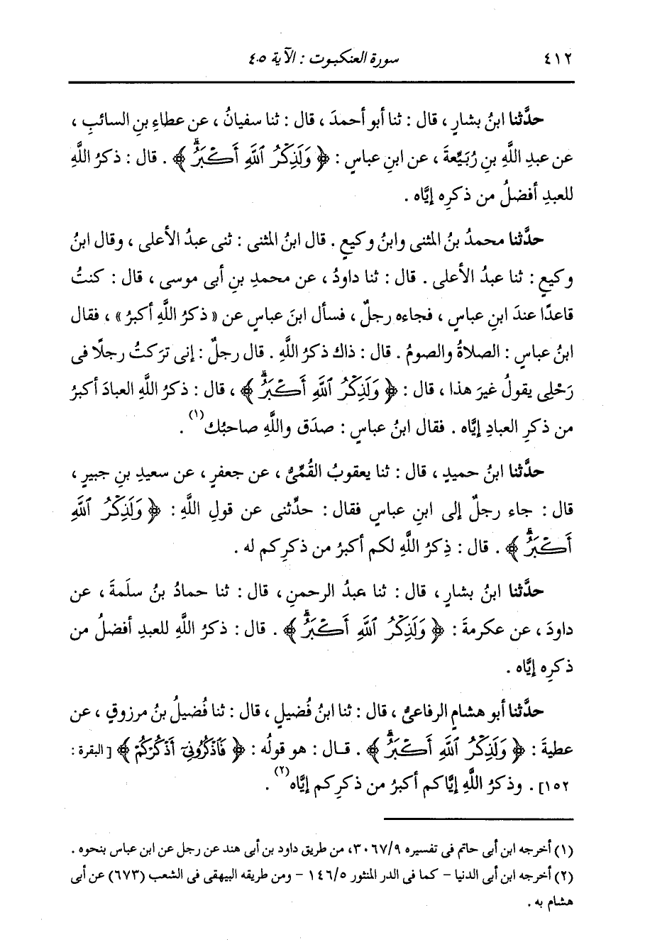 حَدَّثَنَا ابْنُ بَشَّارٍ، قَالَ: ثنا أَبُو أَحْمَدَ، قَالَ: ثنا سُفْيَانُ، عَنْ عَطَاءِ بْنِ السَّائِبِ، عَنْ عَبْدِ اللَّهِ بْنِ رَبِيعَةَ، عَنِ ابْنِ عَبَّاسٍ " {§وَلَذِكْرُ اللَّهِ أَكْبَرُ} [العنكبوت: 45] قَالَ: ذِكْرُ اللَّهِ لِلْعَبْدِ أَفْضَلُ مِنْ ذِكْرِهِ إِيَّاهُ "