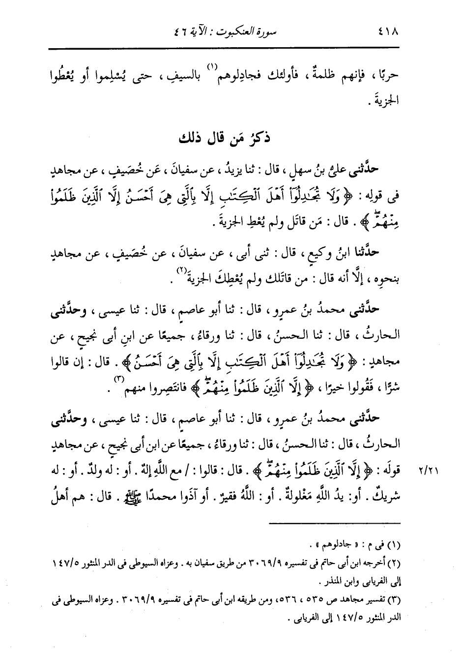 ذِكْرُ مَنْ قَالَ ذَلِكَ: حَدَّثَنِي عَلِيُّ بْنُ سَهْلٍ، قَالَ: ثنا يَزِيدُ، عَنْ سُفْيَانَ، عَنْ خُصَيْفٍ، عَنْ مُجَاهِدٍ، فِي قَوْلِهِ: " {§وَلَا تُجَادِلُوا أَهْلَ الْكِتَابِ إِلَّا بِالَّتِي هِيَ أَحْسَنُ إِلَّا الَّذِينَ ظَلَمُوا مِنْهُمْ} [العنكبوت: 46] قَالَ: مَنْ قَاتَلَ وَلَمْ يُعْطِ الْجِزْيَةَ ". حَدَّثَنَا ابْنُ وَكِيعٍ، قَالَ: ثني أَبِي، عَنْ سُفْيَانَ، عَنْ خُصَيْفٍ، عَنْ مُجَاهِدٍ، بِنَحْوِهِ. إِلَّا أَنَّهُ قَالَ: مَنْ قَاتَلَكَ وَلَمْ يُعْطِكَ الْجِزْيَةَ