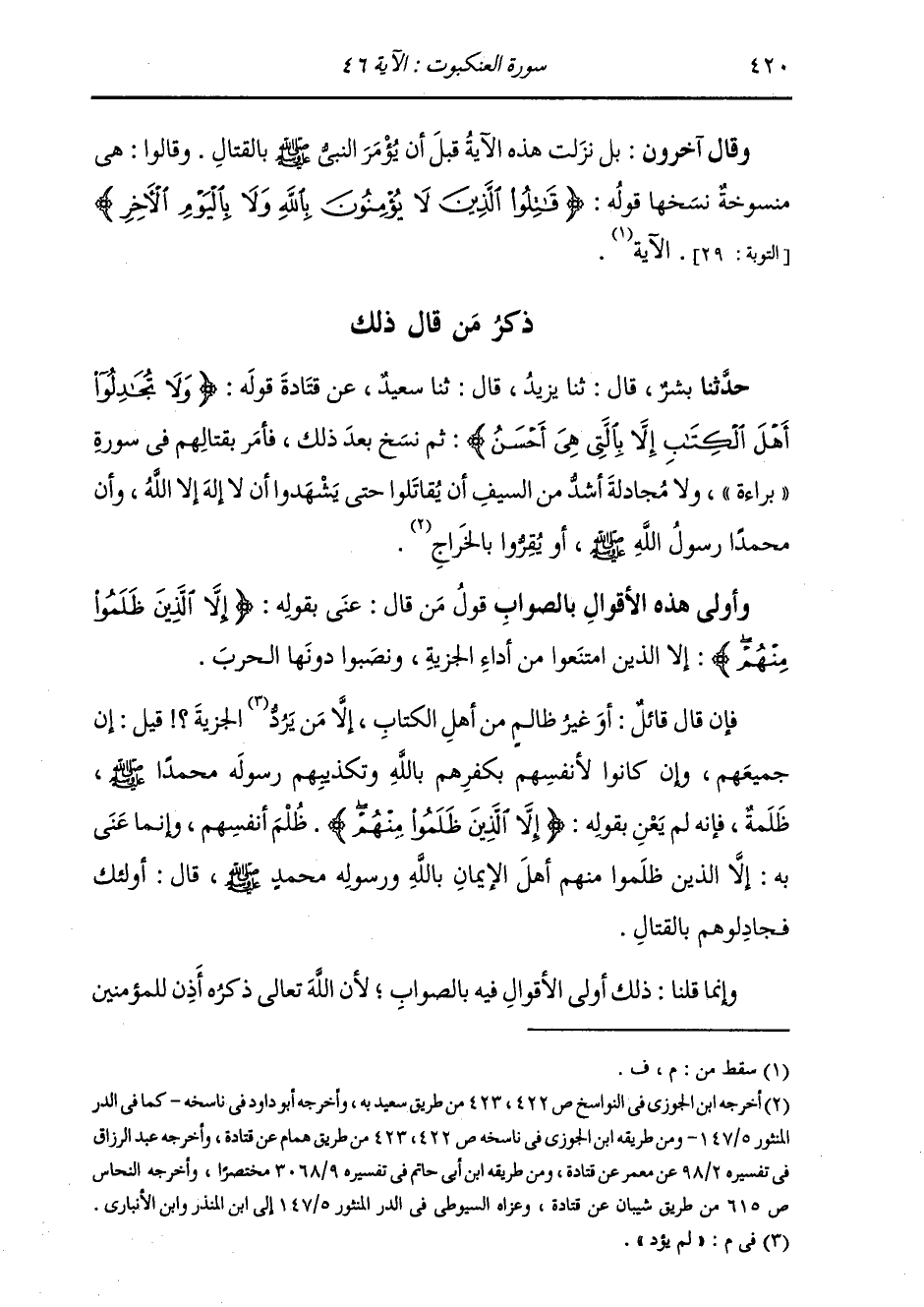 ذِكْرُ مَنْ قَالَ ذَلِكَ: حَدَّثَنَا بِشْرٌ، قَالَ: ثنا يَزِيدُ، قَالَ: ثنا سَعِيدٌ، عَنْ قَتَادَةَ، قَوْلُهُ " {§وَلَا تُجَادِلُوا أَهْلَ الْكِتَابِ إِلَّا بِالَّتِي هِيَ أَحْسَنُ} [العنكبوت: 46] ثُمَّ نُسِخَ بَعْدَ ذَلِكَ، فَأَمَرَ بِقِتَالِهِمْ فِي سُورَةِ بَرَاءَةَ، وَلَا مُجَادَلَةَ أَشَدُّ مِنَ السَّيْفِ أَنْ يُقَاتَلُوا حَتَّى يَشْهَدُوا أَنْ لَا إِلَهَ إِلَّا اللَّهُ، وَأَنَّ مُحَمَّدًا رَسُولُ اللَّهِ صَلَّى اللهُ عَلَيْهِ وَسَلَّمَ، أَوْ يُقِرُّوا بِالْخَرَاجِ ". وَأَوْلَى هَذِهِ الْأَقْوَالِ بِالصَّوَابِ، قَوْلُ مَنْ قَالَ: عُنِيَ بِقَوْلِهِ {إِلَّا الَّذِينَ ظَلَمُوا مِنْهُمْ} [البقرة: 150] إِلَّا الَّذِينَ امْتَنَعُوا مِنْ أَدَاءِ الْجِزْيَةِ، وَنَصَبُوا دُونَهَا الْحَرْبَ. فَإِنْ قَالَ قَائِلٌ: أَوَ غَيْرُ ظَالِمٍ مِنْ أَهْلِ الْكِتَابِ، إِلَّا مَنْ لَمْ يُؤَدِّ الْجِزْيَةَ؟ قِيلَ: إِنَّ جَمِيعَهُمْ وَإِنْ كَانُوا لِأَنْفُسِهِمْ بِكُفْرِهِمْ بِاللَّهِ، وَتَكْذِيبِهِمْ رَسُولَهُ مُحَمَّدًا صَلَّى اللهُ عَلَيْهِ وَسَلَّمَ، ظَلَمَةً، فَإِنَّهُ لَمْ يَعْنِ بِقَوْلِهِ {إِلَّا الَّذِينَ ظَلَمُوا مِنْهُمْ} [البقرة: 150] ظُلْمَ أَنْفُسِهِمْ. وَإِنَّمَا عَنَى بِهِ: إِلَّا الَّذِينَ ظَلَمُوا مِنْهُمْ أَهْلَ الْإِيمَانِ بِاللَّهِ وَرَسُولِهِ مُحَمَّدٍ صَلَّى اللهُ عَلَيْهِ وَسَلَّمَ، فَإِنَّ أُولَئِكَ جَادِلُوهُمْ بِالْقِتَالِ. وَإِنَّمَا قُلْنَا: ذَلِكَ أَوْلَى الْأَقْوَالِ فِيهِ بِالصَّوَابِ، لِأَنَّ اللَّهَ تَعَالَى ذِكْرُهُ أَذِنَ لِلْمُؤْمِنِينَ -[421]- بِجِدَالِ ظَلَمَةِ أَهْلِ الْكِتَابِ بِغَيْرِ الَّذِي هُوَ أَحْسَنُ، بِقَوْلِهِ {إِلَّا الَّذِينَ ظَلَمُوا مِنْهُمْ} [البقرة: 150] فَمَعْلُومٌ إِذْ كَانَ قَدْ أَذِنَ لَهُمْ فِي جِدَالِهِمْ، أَنَّ الَّذِينَ لَمْ يُؤْذَنْ لَهُمْ فِي جِدَالِهِمْ إِلَّا بِالَّتِي هِيَ أَحْسَنُ، غَيْرُ الَّذِينَ أُذِنَ لَهُمْ بِذَلِكَ فِيهِمْ، وَأَنَّهُمْ غَيْرُ الْمُؤْمِنِ، لِأَنَّ الْمُؤْمِنَ مِنْهُمْ غَيْرُ جَائِزٍ جِدَالُهُ إِلَّا فِي غَيْرِ الْحَقِّ، لِأَنَّهُ إِذَا جَاءَ بِغَيْرِ الْحَقِّ، فَقَدْ صَارَ فِي مَعْنَى الظَّلَمَةِ فِي الَّذِي خَالَفَ فِيهِ الْحَقَّ. فَإِذْ كَانَ ذَلِكَ كَذَلِكَ، تَبَيَّنَ أَنْ لَا مَعْنَى لِقَوْلِ مَنْ قَالَ: عَنَى بِقَوْلِهِ {وَلَا تُجَادِلُوا أَهْلَ الْكِتَابِ} [العنكبوت: 46] أَهْلَ الْإِيمَانِ مِنْهُمْ، وَكَذَلِكَ لَا مَعْنَى لِقَوْلِ مَنْ قَالَ: نَزَلَتْ هَذِهِ الْآيَةُ قَبْلَ الْأَمْرِ بِالْقِتَالِ، وَزَعَمَ أَنَّهَا مَنْسُوخَةٌ، لِأَنَّهُ لَا خَبَرَ بِذَلِكَ يَقْطَعُ الْعُذْرَ، وَلَا دَلَالَةَ عَلَى صِحَّتِهِ مِنْ فِطْرَةِ عَقْلٍ. وَقَدْ بَيَّنَّا فِي غَيْرِ مَوْضِعٍ مِنْ كِتَابِنَا، أَنَّهُ لَا يَجُوزُ أَنْ يُحْكُمَ عَلَى حُكْمِ اللَّهِ فِي كِتَابِهِ بِأَنَّهُ مَنْسُوخٌ إِلَّا بِحُجَّةٍ يَجِبُ التَّسْلِيمُ لَهَا مِنْ خَبَرٍ أَوْ عَقْلٍ.