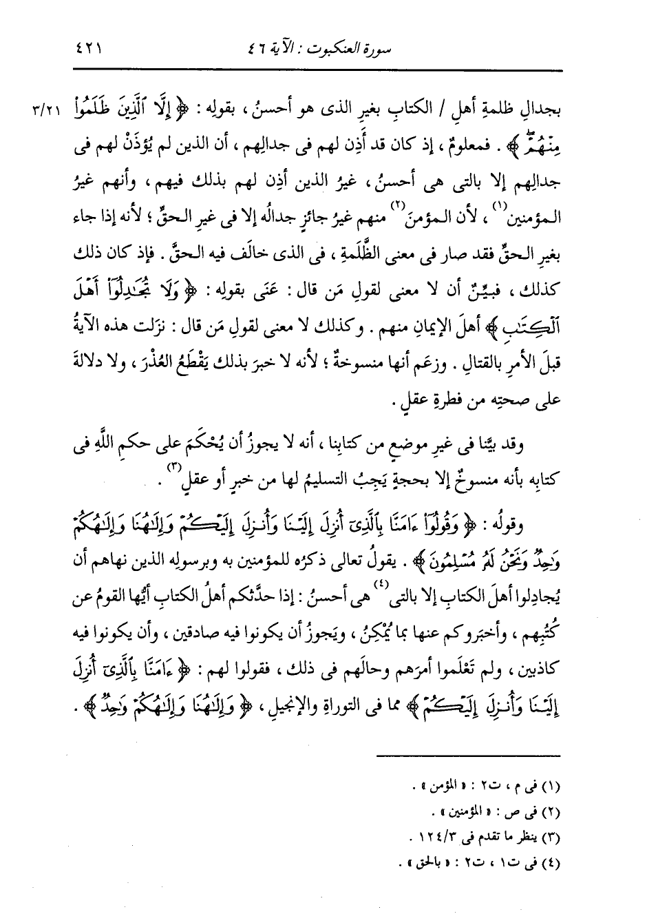 §وَقَوْلُهُ: {وَقُولُوا آمَنَّا بِالَّذِي أُنْزِلَ إِلَيْنَا وَأُنْزِلَ إِلَيْكُمْ وَإِلَهُنَا وَإِلَهُكُمْ وَاحِدٌ وَنَحْنُ لَهُ مُسْلِمُونَ} [العنكبوت: 46] يَقُولُ تَعَالَى ذِكْرُهُ لِلْمُؤْمِنِينَ بِهِ وَبِرَسُولِهِ، الَّذِينَ نَهَاهُمْ أَنْ يُجَادِلُوا أَهْلَ الْكِتَابِ إِلَّا بِالَّتِي هِيَ أَحْسَنُ: إِذَا حَدَّثَكُمْ أَهْلُ الْكِتَابِ أَيُّهَا الْقَوْمُ عَنْ كُتُبِهِمْ، وَأَخْبَرُوكُمْ عَنْهَا بِمَا يُمْكِنُ وَيَجُوزُ أَنْ يَكُونُوا فِيهِ صَادِقِينَ، وَأَنْ يَكُونُوا فِيهِ كَاذِبِينَ، وَلَمْ تَعْلَمُوا أَمْرَهُمْ وَحَالَهُمْ فِي ذَلِكَ , فَقُولُوا لَهُمْ {آمَنَّا بِالَّذِي أُنْزِلَ إِلَيْنَا وَأُنْزِلَ إِلَيْكُمْ} [العنكبوت: 46] مِمَّا فِي التَّوْرَاةِ وَالْإِنْجِيلِ {وَإِلَهُنَا وَإِلَهُكُمْ وَاحِدٌ} [العنكبوت: 46]-[422]- يَقُولُ: وِمَعْبُودُنَا وَمَعْبُودُكُمْ وَاحِدٌ {وَنَحْنُ لَهُ مُسْلِمُونَ} [البقرة: 133] يَقُولُ: وَنَحْنُ لَهُ خَاضِعُونَ مُتَذَلِّلُونَ بِالطَّاعَةِ فِيمَا أَمَرَنَا وَنَهَانَا. وَبِنَحْوِ الَّذِي قُلْنَا فِي ذَلِكَ، جَاءَ الْأَثَرُ عَنْ رَسُولِ اللَّهِ صَلَّى اللهُ عَلَيْهِ وَسَلَّمَ.