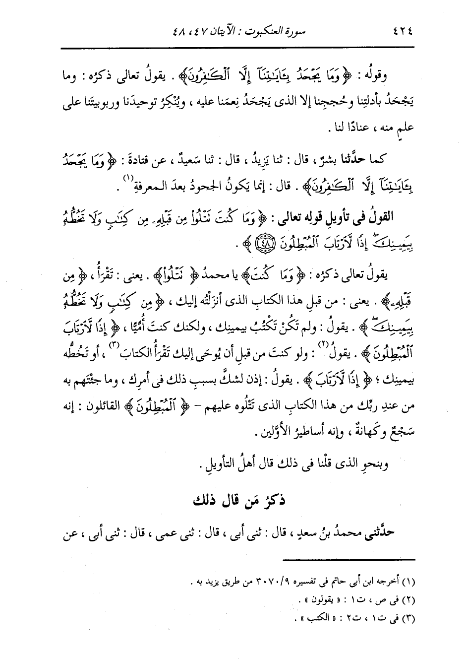 §الْقَوْلُ فِي تَأْوِيلِ قَوْلِهِ تَعَالَى: {وَمَا كُنْتَ تَتْلُو مِنْ قَبْلِهِ مِنْ كِتَابٍ وَلَا تَخُطُّهُ بِيَمِينِكَ إِذًا لَارْتَابَ الْمُبْطِلُونَ} [العنكبوت: 48] يَقُولُ تَعَالَى ذِكْرُهُ: {وَمَا كُنْتَ} [آل عمران: 44] يَا مُحَمَّدُ {تَتْلُو} [يونس: 61] يَعْنِي تَقْرَأُ {مِنْ قَبْلِهِ} [البقرة: 198] يَعْنِي مِنْ قَبْلِ هَذَا الْكِتَابِ الَّذِي أَنْزَلْتُهُ إِلَيْكَ {مِنْ كِتَابٍ وَلَا تَخُطُّهُ بِيَمِينِكَ} [العنكبوت: 48] يَقُولُ: وَلَمْ تَكُنْ تَكْتُبُ بِيَمِينِكَ، وَلَكِنَّكَ كُنْتَ أُمِّيًّا {إِذًا لَارْتَابَ الْمُبْطِلُونَ} [العنكبوت: 48] يَقُولُ: وَلَوْ كُنْتَ مِنْ قَبْلِ أَنْ يُوحَى إِلَيْكَ تَقْرَأُ الْكِتَابَ، أَوْ تَخُطُّهُ بِيَمِينِكَ، إِذَنْ لَارْتَابَ: يَقُولُ: إِذَنْ لَشَكَّ بِسَبَبِ ذَلِكَ فِي أَمْرِكَ، وَمَا جِئْتَهُمْ بِهِ مِنْ عِنْدِ رَبِّكَ مِنْ هَذَا الْكِتَابِ الَّذِي تَتْلُوهُ عَلَيْهِمُ الْمُبْطِلُونَ , الْقَائِلُونَ: إِنَّهُ سَجْعٌ وَكَهَانَةٌ، وَإِنَّهُ أَسَاطِيرُ الْأَوَّلِينَ. وَبِنَحْوِ الَّذِي قُلْنَا فِي ذَلِكَ قَالَ أَهْلُ التَّأْوِيلِ.