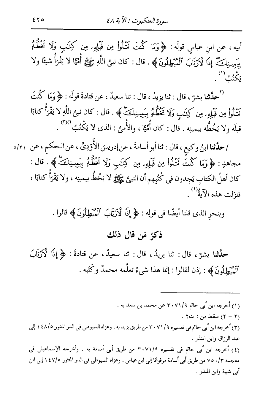 ذِكْرُ مَنْ قَالَ ذَلِكَ: حَدَّثَنَا بِشْرٌ، قَالَ: ثنا يَزِيدُ، قَالَ: ثنا سَعِيدٌ، عَنْ قَتَادَةَ، " {§إِذًا لَارْتَابَ الْمُبْطِلُونَ} [العنكبوت: 48] إِذَنْ لَقَالُوا: إِنَّمَا هَذَا شَيْءٌ تَعَلَّمَهُ مُحَمَّدٌ صَلَّى اللهُ عَلَيْهِ وَسَلَّمَ وَكَتَبَهُ "