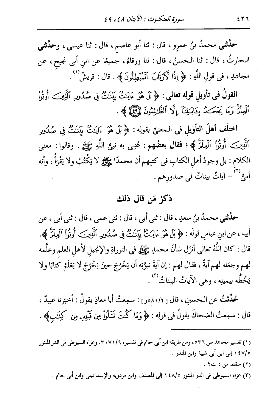 ذِكْرُ مَنْ قَالَ ذَلِكَ: حَدَّثَنِي مُحَمَّدُ بْنُ سَعْدٍ، قَالَ: ثني أَبِي، قَالَ: ثتي عَمِّي، قَالَ: ثني أَبِي، عَنْ أَبِيهِ، عَنِ ابْنِ عَبَّاسٍ، قَوْلُهُ " {§بَلْ هُوَ آيَاتٌ بَيِّنَاتٌ فِي صُدُورِ الَّذِينَ أُوتُوا الْعِلْمَ} [العنكبوت: 49] قَالَ: كَانَ اللَّهُ تَعَالَى أَنْزَلَ شَأْنَ مُحَمَّدٍ صَلَّى اللهُ عَلَيْهِ وَسَلَّمَ فِي التَّوْرَاةِ وَالْإِنْجِيلِ لِأَهْلِ الْعِلْمِ وَعَلَّمَهُ لَهُمْ، وَجَعَلَهُ لَهُمْ آيَةً، فَقَالَ لَهُمْ: إِنَّ آيَةَ نُبُوَّتِهِ أَنْ يَخْرُجَ حِينَ يَخْرُجُ لَا يَعْلَمُ كِتَابًا، وَلَا يَخُطُّهُ بِيَمِينِهِ، وَهِيَ الْآيَاتُ الْبَيِّنَاتُ "