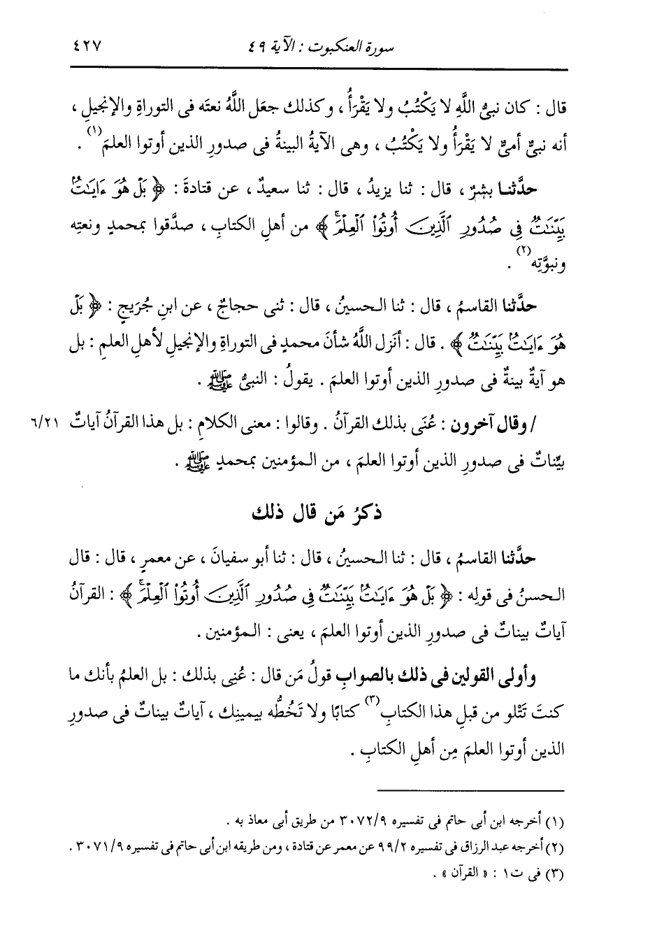 ذِكْرُ مَنْ قَالَ ذَلِكَ: حَدَّثَنَا الْقَاسِمُ، قَالَ: ثنا الْحُسَيْنُ، قَالَ: ثنا أَبُو سُفْيَانَ، عَنْ مَعْمَرٍ، قَالَ: قَالَ الْحَسَنُ، فِي قَوْلِهِ: " {§بَلْ هُوَ آيَاتٌ بَيِّنَاتٌ فِي صُدُورِ الَّذِينَ أُوتُوا الْعِلْمَ} [العنكبوت: 49] الْقُرْآنُ آيَاتٌ بَيِّنَاتٌ فِي صُدُورِ الَّذِينَ أُوتُوا الْعِلْمَ، يَعْنِي الْمُؤْمِنِينَ ". وَأَوْلَى الْقَوْلَيْنِ فِي ذَلِكَ بِالصَّوَابِ قَوْلُ مَنْ قَالَ: عُنِيَ بِذَلِكَ: بَلِ الْعِلْمُ بِأَنَّكَ مَا كُنْتَ تَتْلُو مِنْ قَبْلِ هَذَا الْكِتَابِ كِتَابًا، وَلَا تَخُطُّهُ بِيَمِينِكَ، آيَاتٌ بَيِّنَاتٌ فِي صُدُورِ الَّذِينَ أُوتُوا الْعِلْمَ مِنْ أَهْلِ الْكِتَابِ. -[428]- وَإِنَّمَا قُلْتُ: ذَلِكَ أَوْلَى التَّأْوِيلَيْنِ بِالْآيَةِ، لِأَنَّ قَوْلَهُ: {بَلْ هُوَ آيَاتٌ بَيِّنَاتٌ فِي صُدُورِ الَّذِينَ أُوتُوا الْعِلْمَ} [العنكبوت: 49] بَيْنَ خَبَرَيْنِ مِنْ أَخْبَارِ اللَّهِ عَنْ رَسُولِهِ مُحَمَّدٍ صَلَّى اللهُ عَلَيْهِ وَسَلَّمَ، فَهُوَ بِأَنْ يَكُونَ خَبَرًا عَنْهُ أَوْلَى مِنْ أَنْ يَكُونَ خَبَرًا عَنِ الْكِتَابِ الَّذِي قَدِ انْقَضَى الْخَبَرُ عَنْهُ قَبْلُ.