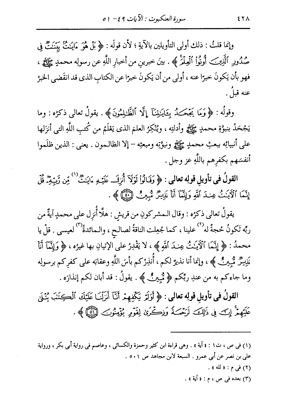 §الْقَوْلُ فِي تَأْوِيلِ قَوْلِهِ تَعَالَى: {أَوَلَمْ يَكْفِهِمْ أَنَّا أَنْزَلْنَا عَلَيْكَ الْكِتَابَ يُتْلَى عَلَيْهِمْ إِنَّ فِي ذَلِكَ لَرَحْمَةً وَذِكْرَى لِقَوْمٍ يُؤْمِنُونَ} [العنكبوت: 51]-[429]- يَقُولُ تَعَالَى ذِكْرُهُ: أَوَ لَمْ يَكْفِ هَؤُلَاءِ الْمُشْرِكِينَ يَا مُحَمَّدُ، الْقَائِلِينَ: لَوْلَا أُنْزِلَ عَلَى مُحَمَّدٍ صَلَّى اللهُ عَلَيْهِ وَسَلَّمَ آيَةٌ مِنْ رَبِّهِ، مِنَ الْآيَاتِ وَالْحُجَجِ {أَنَّا أَنْزَلْنَا عَلَيْكَ} [العنكبوت: 51] هَذَا {الْكِتَابَ يُتْلَى عَلَيْهِمْ} [العنكبوت: 51] يَقُولُ: يُقْرَأُ عَلَيْهِمْ {إِنَّ فِي ذَلِكَ لَرَحْمَةً} [العنكبوت: 51] يَقُولُ: إِنَّ فِي هَذَا الْكِتَابِ الَّذِي أَنْزَلْنَا عَلَيْهِمْ لَرَحْمَةً لِلْمُؤْمِنِينَ بِهِ , وَذِكْرَى يَتَذَكَّرُونَ بِمَا فِيهِ مِنْ عِبْرَةٍ وَعِظَةٍ، وَذُكِرَ أَنَّ هَذِهِ الْآيَةَ نَزَلَتْ مِنْ أَجْلِ أَنَّ قَوْمًا مِنْ أَصْحَابِ رَسُولِ اللَّهِ صَلَّى اللهُ عَلَيْهِ وَسَلَّمَ انْتَسَخُوا شَيْئًا مِنْ بَعْضِ كُتُبِ أَهْلِ الْكِتَابِ.