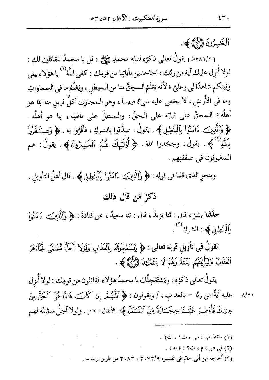 الْخَاسِرُونَ} يَقُولُ تَعَالَى ذِكْرُهُ لِنَبِيِّهِ مُحَمَّدٍ صَلَّى اللهُ عَلَيْهِ وَسَلَّمَ: قُلْ يَا مُحَمَّدُ لِلْقَائِلِينَ لَكَ: لَوْلَا أُنْزِلَ عَلَيْكَ آيَةٌ مِنْ رَبِّكَ، الْجَاحِدِينَ بِآيَاتِنَا مِنْ قَوْمِكَ: كَفَى اللَّهُ يَا هَؤُلَاءِ بَيْنِي وَبَيْنَكُمْ شَاهِدًا لِي وَعَلَيَّ، لِأَنَّهُ يَعْلَمُ الْمُحِقَّ مِنَّا مِنَ الْمُبْطِلِ، وَيَعْلَمُ مَا فِي السَّمَاوَاتِ وَمَا فِي الْأَرْضِ، لَا يَخْفَى عَلَيْهِ شَيْءٌ فِيهِمَا، وَهُوَ الْمُجَازِي كُلَّ فَرِيقٍ مِنَّا بِمَا هُوَ أَهْلُهُ، الْمُحِقَّ عَلَى ثَبَاتِهِ عَلَى الْحَقِّ، وَالْمُبْطِلَ عَلَى بَاطِلِهِ، بِمَا هُوَ أَهْلُهُ {وَالَّذِينَ آمَنُوا بِالْبَاطِلِ} [العنكبوت: 52] يَقُولُ: صَدَّقُوا بِالشِّرْكِ، فَأَقَرُّوا بِهِ {وَكَفَرُوا بِاللَّهِ} [العنكبوت: 52] يَقُولُ: وَجَحَدُوا اللَّهَ {أُولَئِكَ هُمُ الْخَاسِرُونَ} [البقرة: 27] يَقُولُ: هُمُ الْمَغْبُونُونَ فِي صَفْقَتِهِمْ. وَبِنَحْوِ الَّذِي قُلْنَا فِي قَوْلِهِ {وَالَّذِينَ آمَنُوا بِالْبَاطِلِ} [العنكبوت: 52] قَالَ أَهْلُ التَّأْوِيلِ.