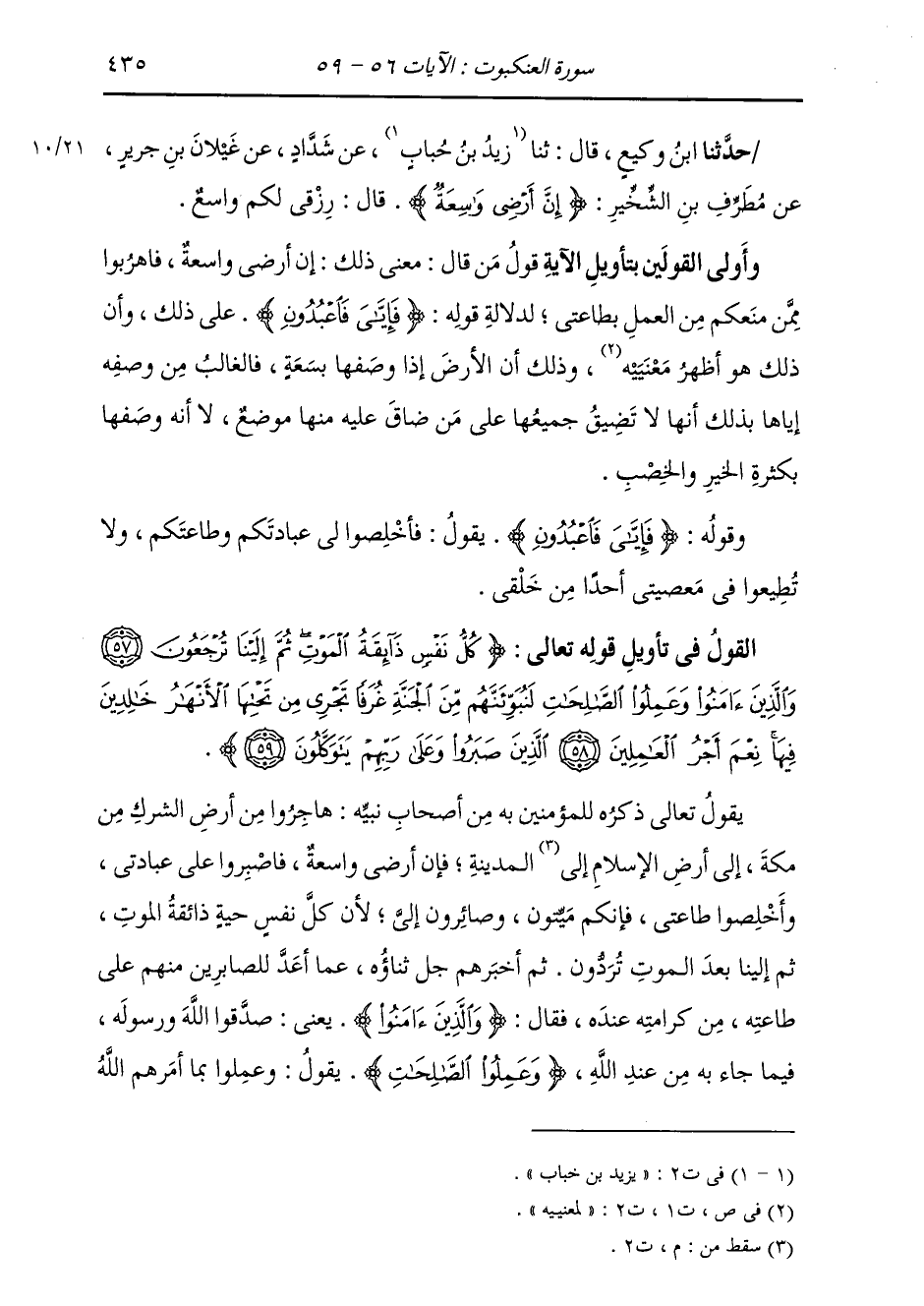 حَدَّثَنَا ابْنُ وَكِيعٍ، قَالَ: ثنا زَيْدُ بْنُ حُبَابٍ، عَنْ شَدَّادٍ، عَنْ غَيْلَانَ بْنِ جَرِيرٍ، عَنْ مُطَرِّفِ بْنِ الشِّخِّيرِ، " {§إِنَّ أَرْضِي وَاسِعَةٌ} [العنكبوت: 56] قَالَ: رِزْقِي لَكُمْ وَاسِعٌ ". وَأَوْلَى الْقَوْلَيْنِ بِتَأْوِيلِ الْآيَةِ قَوْلُ مَنْ قَالَ: مَعْنَى ذَلِكَ: إِنَّ أَرْضِي وَاسِعَةٌ، فَاهْرُبُوا مِمَّنْ مَنَعَكُمْ مِنَ الْعَمَلِ بِطَاعَتِي لِدَلَالَةِ قَوْلِهِ {فَإِيَّايَ فَاعْبُدُونِ} [العنكبوت: 56] عَلَى ذَلِكَ، وَأَنَّ ذَلِكَ هُوَ أَظْهَرُ مَعْنَيَيْهِ، وَذَلِكَ أَنَّ الْأَرْضَ إِذَا وَصَفَهَا بِسَعَةٍ، فَالْغَالِبُ مِنْ وَصْفِهِ إِيَّاهَا بِذَلِكَ، أَنَّهَا لَا تَضِيقُ جَمِيعُهَا عَلَى مَنْ ضَاقَ عَلَيْهِ مِنْهَا مَوْضِعٌ، لَا أَنَّهُ وَصَفَهَا بِكَثْرَةِ الْخَيْرِ وَالْخَصْبِ.