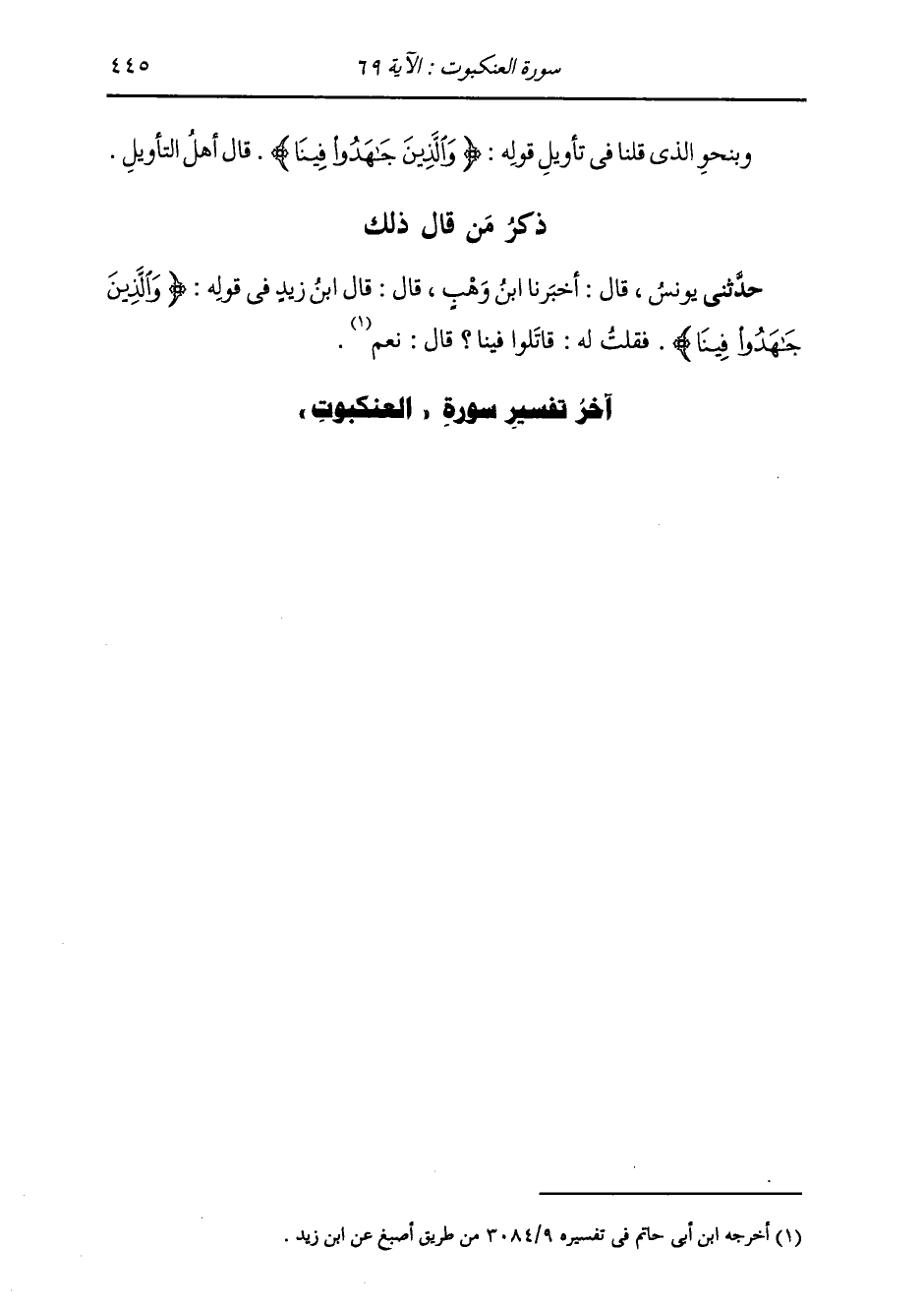 ذِكْرُ مَنْ قَالَ ذَلِكَ: حَدَّثَنِي يُونُسُ، قَالَ: أَخْبَرَنَا ابْنُ وَهْبٍ، قَالَ: قَالَ ابْنُ زَيْدٍ، فِي قَوْلِهِ " {§وَالَّذِينَ جَاهَدُوا فِينَا} [العنكبوت: 69] فَقُلْتُ لَهُ: قَاتَلُوا فِينَا؟ قَالَ: نَعَمْ "