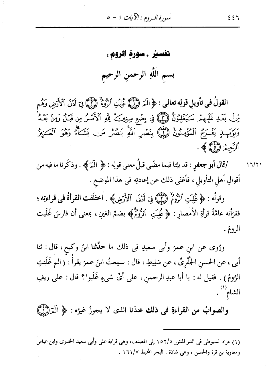 §الْقَوْلُ فِي تَأْوِيلِ قَوْلِهِ تَعَالَى: {الم. غُلِبَتِ الرُّومُ. فِي أَدْنَى الْأَرْضِ وَهُمْ مِنْ بَعْدِ غَلَبِهِمْ سَيَغْلِبُونَ. فِي بِضْعِ سِنِينَ. لِلَّهِ الْأَمْرُ مِنْ قَبْلُ وَمِنْ بَعْدُ، وَيَوْمَئِذٍ يَفْرَحُ الْمُؤْمِنُونَ بِنَصْرِ اللَّهِ، يَنْصُرُ مَنْ يَشَاءُ، وَهُوَ الْعَزِيزُ الرَّحِيمُ} [الروم: 2] قَالَ أَبُو جَعْفَرٍ: اخْتَلَفَتْ تَرَاجِمَةُ الْقُرْآنِ فِي تَأْوِيلِ قَوْلِ اللَّهِ تَعَالَى ذِكْرُهُ: {الم} [البقرة: 1] فَقَالَ بَعْضُهُمْ: هُوَ اسْمٌ مِنْ أَسْمَاءِ الْقُرْآنِ.