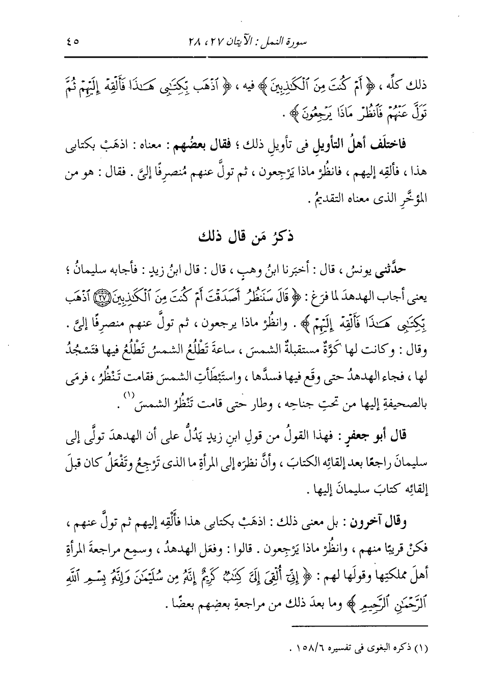 ذِكْرُ مَنْ قَالَ ذَلِكَ: حَدَّثَنِي يُونُسُ، قَالَ: أَخْبَرَنَا ابْنُ وَهْبٍ، قَالَ: قَالَ ابْنُ زَيْدٍ: " §فَأَجَابَهُ سُلَيْمَانُ، يَعْنِي أَجَابَ الْهُدْهُدَ لَمَّا فَرَغَ: {قَالَ سَنَنْظُرُ أَصَدَقْتَ أَمْ كُنْتَ مِنَ الْكَاذِبِينَ. اذْهَبْ بِكِتَابِي هَذَا فَأَلْقِهْ إِلَيْهِمْ} [النمل: 28] وَانْظُرْ مَاذَا يَرْجِعُونَ، ثُمَّ تَوَلَّ عَنْهُمْ مُنْصَرِفًا إِلَيَّ. وَقَالَ: وَكَانَتْ لَهَا كَوَّةٌ مُسْتَقْبِلَةَ الشَّمْسِ سَاعَةَ تَطْلُعُ الشَّمْسُ تَطْلُعُ فِيهَا فَتَسْجُدُ لَهَا، فَجَاءَ الْهُدْهُدُ حَتَّى وَقَعَ فِيهَا فَسَدَّهَا، وَاسْتَبْطَأَتِ الشَّمْسَ، فَقَامَتْ تَنْظُرُ، فَرَمَى بِالصَّحِيفَةِ إِلَيْهَا مِنْ تَحْتِ جَنَاحِهِ، وَطَارَ حَتَّى قَامَتْ تَنْظُرُ الشَّمْسَ ". قَالَ أَبُو جَعْفَرٍ: فَهَذَا الْقَوْلُ مِنْ قَوْلِ ابْنِ زَيْدٍ يَدُلُّ عَلَى أَنَّ الْهُدْهُدَ تَوَلَّى إِلَى سُلَيْمَانَ رَاجِعًا، بَعْدَ إِلْقَائِهِ الْكِتَابَ، وَأَنَّ نَظَرَهُ إِلَى الْمَرْأَةِ مَا الَّذِي تَرْجِعُ وَتَفْعَلُ كَانَ قَبْلَ إِلْقَائِهِ كِتَابَ سُلَيْمَانَ إِلَيْهَا. وَقَالَ آخَرُونَ: بَلْ مَعْنَى ذَلِكَ: اذْهَبْ بِكِتَابِي هَذَا فَأَلْقِهْ إِلَيْهِمْ، ثُمَّ تَوَلَّ عَنْهُمْ، فَكُنْ قَرِيبًا مِنْهُمْ، وَانْظُرْ مَاذَا يَرْجِعُونَ؛ قَالُوا: وَفَعَلَ الْهُدْهُدُ، وَسَمِعَ مُرَاجَعَةَ الْمَرْأَةِ أَهْلَ مَمْلَكَتِهَا، وَقَوْلَهَا لَهُمْ: {إِنِّي أُلْقِيَ إِلَيَّ كِتَابٌ كَرِيمٌ. إِنَّهُ مِنْ سُلَيْمَانَ، وَإِنَّهُ بِسْمِ اللَّهِ الرَّحْمَنِ الرَّحِيمِ} [النمل: 29] وَمَا بَعْدَ ذَلِكَ مِنْ مُرَاجَعَةِ بَعْضِهِمْ بَعْضًا.