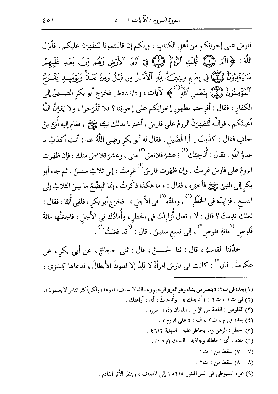 فَارِسَ عَلَى إِخْوَانِكُمْ مِنْ أَهْلِ الْكِتَابِ، وَإِنَّكُمْ إِنْ قَاتَلْتُمُونَا لَنَظْهَرَنَّ عَلَيْكُمْ، فَأَنْزَلَ اللَّهُ {الم غُلِبَتِ الرُّومُ فِي أَدْنَى الْأَرْضِ وَهُمْ مِنْ بَعْدِ غَلَبِهِمْ سَيَغْلِبُونَ. فِي بِضْعِ سِنِينَ. لِلَّهِ الْأَمْرُ مِنْ قَبْلُ وَمِنْ بَعْدُ، وَيَوْمَئِذٍ يَفْرَحُ الْمُؤْمِنُونَ. بِنَصْرِ اللَّهِ} [الروم: 2] ، فَخَرَجَ أَبُو بَكْرٍ الصِّدِّيقُ إِلَى الْكُفَّارِ، فَقَالَ: أَفَرِحْتُمْ بِظُهُورِ إِخْوَانِكُمْ عَلَى إِخْوَانِنَا؟ فَلَا تَفْرَحُوا، وَلَا يُقِرَّنَّ اللَّهُ أَعْيُنَكُمْ، فَوَاللَّهِ لَيَظْهَرَنَّ الرُّومُ عَلَى فَارِسَ، أَخْبَرَنَا بِذَلِكَ نَبِيُّنَا صَلَّى اللهُ عَلَيْهِ وَسَلَّمَ، فَقَامَ إِلَيْهِ أُبَيُّ بْنُ خَلَفٍ فَقَالَ: كَذَبْتَ يَا أَبَا فُضَيْلٍ، فَقَالَ لَهُ أَبُو بَكْرٍ: أَنْتَ أَكْذَبُ يَا عَدُوَّ اللَّهِ، فَقَالَ: أُنَاحِبُكَ عَشْرَ قَلَائِصَ مِنِّي، وَعَشْرَ قَلَائِصَ مِنْكَ، فَإِنْ ظَهَرَتِ الرُّومُ عَلَى فَارِسَ غَرِمْتَ، وَإِنْ ظَهَرَتْ فَارِسُ عَلَى الرُّومِ غَرِمْتُ إِلَى ثَلَاثِ سِنِينَ، ثُمَّ جَاءَ أَبُو بَكْرٍ إِلَى النَّبِيِّ صَلَّى اللهُ عَلَيْهِ وَسَلَّمَ فَأَخْبَرَهُ، فَقَالَ: «وَمَا هَكَذَا ذَكَرْتُ، إِنَّمَا §الْبِضْعُ مَا بَيْنَ الثَّلَاثِ إِلَى التِّسْعِ، فَزَايِدْهُ فِي الْخَطَرِ، وَمَادِّهِ فِي الْأَجَلِ» ، فَخَرَجَ أَبُو بَكْرٍ فَلَقِيَ أُبَيًّا، فَقَالَ: لَعَلَّكَ نَدِمْتَ، فَقَالَ: لَا، فَقَالَ: أُزَايِدُكَ فِي الْخَطَرِ، وَأُمَادُّكَ فِي الْأَجَلِ، فَاجْعَلْهَا مِائَةَ قَلُوصٍ لِمِائَةِ قَلُوصٍ إِلَى تِسْعِ سِنِينَ، قَالَ: قَدْ فَعَلْتُ "