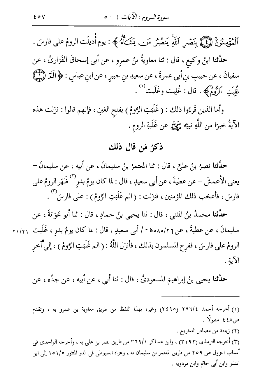 حَدَّثَنَا مُحَمَّدُ بْنُ الْمُثَنَّى، قَالَ: ثنا يَحْيَى بْنُ حَمَّادٍ، قَالَ: ثنا أَبُو عَوَانَةَ، عَنْ سُلَيْمَانَ، عَنْ عَطِيَّةَ، عَنْ أَبِي سَعِيدٍ، قَالَ: «§لَمَّا كَانَ يَوْمُ بَدْرٍ غَلَبَتِ الرُّومُ عَلَى فَارِسَ، فَفَرِحَ الْمُسْلِمُونَ بِذَلِكَ، فَأَنْزَلَ اللَّهُ (الم. غَلَبَتِ الرُّومُ) إِلَى آخِرِ الْآيَةِ»
