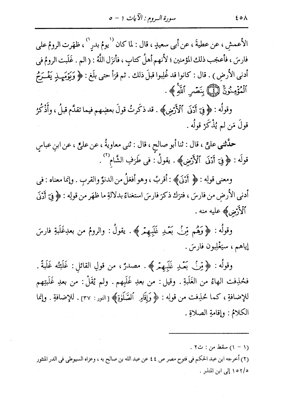 حَدَّثَنِي عَلِيٌّ، قَالَ: ثنا أَبُو صَالِحٍ، قَالَ: ثني مُعَاوِيَةُ، عَنْ عَلِيٍّ، عَنِ ابْنِ عَبَّاسٍ، قَوْلُهُ " {§فِي أَدْنَى الْأَرْضِ} [الروم: 3] يَقُولُ: فِي طَرَفِ الشَّامِ ". وَمَعْنَى قَوْلُهُ أَدْنَى: أَقْرَبُ، وَهُوَ أَفْعَلُ مِنَ الدُّنُوِّ، وَالْقُرْبِ. وَإِنَّمَا مَعْنَاهُ: فِي أَدْنَى الْأَرْضِ مِنْ فَارِسَ، فَتَرَكَ ذِكْرَ فَارِسَ اسْتِغْنَاءً بِدَلَالَةِ مَا ظَهْرَ مِنْ قَوْلِهِ: {فِي أَدْنَى الْأَرْضِ} [الروم: 3] عَلَيْهِ مِنْهُ. وَقَوْلُهُ: {وَهُمْ مِنْ بَعْدِ غَلَبِهِمْ} [الروم: 3] يَقُولُ: وَالرُّومُ مِنْ بَعْدِ غَلَبَةِ فَارِسَ إِيَّاهُمْ سَيَغْلِبُونَ فَارِسَ، وَقَوْلُهُ: {مِنْ بَعْدِ غَلَبِهِمْ} [الروم: 3] مَصْدَرٌ مِنْ قَوْلِ الْقَائِلِ: غَلَبْتُهُ غَلَبَةً، فَحُذِفَتِ الْهَاءُ مِنَ الْغَلَبَةِ، وَقِيلَ: مِنْ بَعْدِ غَلَبِهِمْ، وَلَمْ يَقُلْ: مِنْ بَعْدِ غَلَبَتِهِمْ لِلْإِضَافَةِ، كَمَا حُذِفَتْ مِنْ قَوْلِهِ: {وَإِقَامِ الصَّلَاةِ} [الأنبياء: 73] لِلْإِضَافَةِ. وَإِنَّمَا الْكَلَامُ: وَإِقَامَةِ الصَّلَاةِ