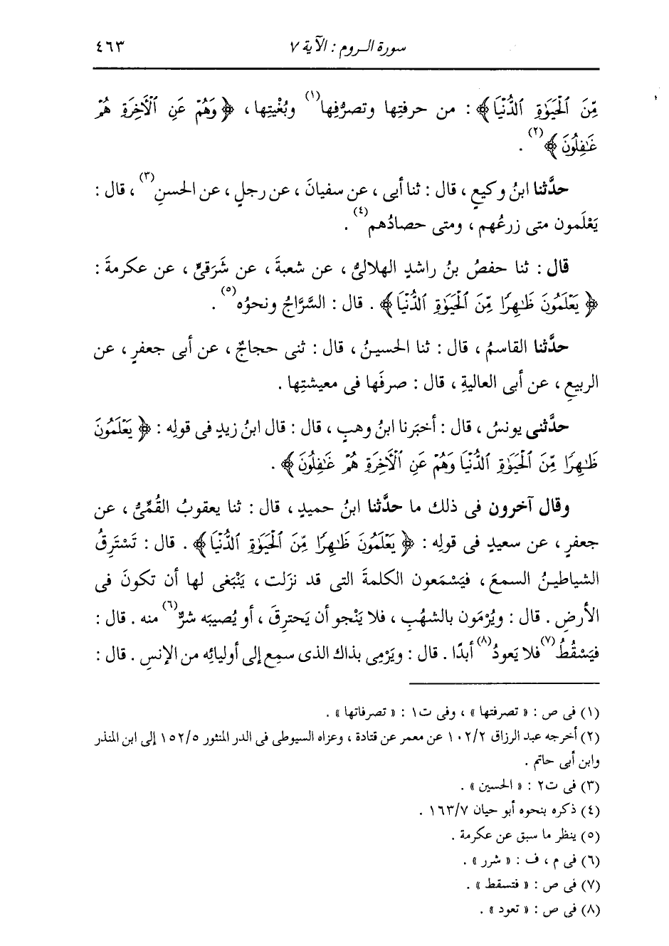 حَدَّثَنَا الْقَاسِمُ، قَالَ: ثنا الْحُسَيْنُ، قَالَ: ثني حَجَّاجٌ، عَنْ أَبِي جَعْفَرٍ، عَنِ الرَّبِيعِ، عَنْ أَبِي الْعَالِيَةِ، قَالَ: «§صَرْفَهَا فِي مَعِيشَتِهَا» . حَدَّثَنِي يُونُسُ، قَالَ: أَخْبَرَنَا ابْنُ وَهْبٍ، قَالَ: قَالَ ابْنُ زَيْدٍ، فِي قَوْلِهِ {يَعْلَمُونَ ظَاهِرًا مِنَ الْحَيَاةِ الدُّنْيَا، وَهُمْ عَنِ الْآخِرَةِ هُمْ غَافِلُونَ} [الروم: 7] . وَقَالَ آخَرُونَ فِي ذَلِكَ مَا: