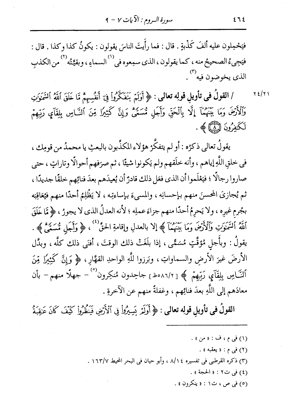 §الْقَوْلُ فِي تَأْوِيلِ قَوْلِهِ تَعَالَى: {أَوَلَمْ يَتَفَكَّرُوا فِي أَنْفُسِهِمْ مَا خَلَقَ اللَّهُ السَّمَوَاتِ وَالْأَرْضَ وَمَا بَيْنَهُمَا إِلَّا بِالْحَقِّ وَأَجَلٍّ مُسَمًّى وَإِنَّ كَثِيرًا مِنَ النَّاسِ بِلِقَاءِ رَبِّهِمْ لَكَافِرُونَ} يَقُولُ تَعَالَى ذِكْرُهُ: أَوَلَمْ يَتَفَكَّرَ هَؤُلَاءِ الْمُكَذِّبُونَ بِالْبَعْثِ يَا مُحَمَّدُ مِنْ قَوْمِكَ فِي خَلْقِ اللَّهِ إِيَّاهُمْ، وَأَنَّهُ خَلَقَهُمْ وَلَمْ يَكُونُوا شَيْئًا، ثُمَّ صَرَفَهُمْ أَحْوَالًا وَتَارَاتٍ حَتَّى صَارُوا رِجَالًا، فَيَعْلَمُوا أَنَّ الَّذِي فَعَلَ ذَلِكَ قَادِرٌ أَنْ يُعِيدَهُمْ بَعْدَ فَنَائِهِمْ خَلْقًا جَدِيدًا، ثُمَّ يُجَازِي الْمُحْسِنَ مِنْهُمْ بِإِحْسَانِهِ. وَالْمُسِيءَ بِإِسَاءَتِهِ، لَا يَظْلِمُ أَحَدًا مِنْهُمْ فَيُعَاقِبُهُ بِجُرْمِ غَيْرِهِ، وَلَا يَحْرِمُ أَحَدًا مِنَهُمْ جَزَاءَ عَمَلِهِ، لِأَنَّهُ الْعَدْلُ الَّذِي لَا يَجُورُ، {مَا خَلَقَ اللَّهُ السَّمَوَاتِ وَالْأَرْضَ وَمَا بَيْنَهُمَا} إِلَّا بِالْعَدْلِ، وَإِقَامَةِ الْحَقِّ، {وَأَجَلٍّ مُسَمًّى} [الأنعام: 2] يَقُولُ: وَبِأَجَلٍ مُؤَقَّتٍ مُسَمًّى، إِذَا بَلَغَتْ ذَلِكَ الْوَقْتَ أَفْنَى ذَلِكَ كُلَّهُ، وَبَدَّلَ الْأَرْضَ غَيْرَ الْأَرْضِ وَالسَّمَاوَاتِ، وَبَرَزُوا لِلَّهِ الْوَاحِدِ الْقَهَّارِ، {وَإِنَّ كَثِيرًا مِنَ النَّاسِ بِلِقَاءِ رَبِّهِمْ} [الروم: 8] جَاحِدُونَ مُنْكِرُونَ، جَهْلًا مِنْهُمْ بِأَنَّ مَعَادَهُمْ إِلَى اللَّهِ بَعْدَ فَنَائِهِمْ، وَغَفْلَةٍ مِنْهُمْ عَنِ الْآخِرَةِ.