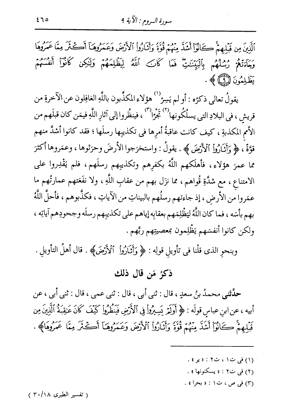 الَّذِينَ مِنْ قَبْلِهِمْ كَانُوا أَشَدَّ مِنْهُمْ قُوَّةً وَأَثَارُوا الْأَرْضَ وَعَمَرُوهَا أَكْثَرَ مِمَّا عَمَرُوهَا، وَجَاءَتْهُمْ رُسُلُهُمْ بِالْبَيِّنَاتِ، فَمَا كَانَ اللَّهُ لِيَظْلِمَهُمْ وَلَكِنْ كَانُوا أَنْفُسَهُمْ يَظْلِمُونَ} [الروم: 9] يَقُولُ تَعَالَى ذِكْرُهُ: أَوَلَمْ يَسِيرُ هَؤُلَاءِ الْمُكَذِّبُونَ بِاللَّهِ، الْغَافِلُونَ عَنِ الْآخِرَةِ مِنْ قُرَيْشٍ فِي الْبِلَادِ الَّتِي يَسْلُكُونَهَا تَجْرًا، فَيَنْظُرُوا إِلَى آثَارِ اللَّهِ فِيمَنْ كَانَ قَبْلَهُمْ مِنَ الْأُمَمِ الْمُكَذِّبَةِ، كَيْفَ كَانَ عَاقِبَةُ أَمْرِهَا فِي تَكْذِيبِهَا رُسُلِهَا، فَقَدْ كَانُوا أَشَدَّ مِنْهُمْ قُوَّةً، {وَأَثَارُوا الْأَرْضَ} [الروم: 9] يَقُولُ: وَاسْتَخْرَجُوا الْأَرْضَ، وَحَرَثُوهَا وَعَمَرُوهَا أَكْثَرَ مِمَّا عَمَرَ هَؤُلَاءِ، فَأَهْلَكَهُمُ اللَّهُ بِكُفْرِهِمْ وَتَكْذِيبِهِمْ رُسُلِهِمْ، فَلَمْ يَقْدِرُوا عَلَى الِامْتِنَاعِ، مَعَ شِدَّةِ قُواهُمْ مِمَّا نَزَلَ بِهِمْ مِنْ عِقَابِ اللَّهِ، وَلَا نَفَعَتْهُمْ عِمَارَتُهُمْ مَا عَمَرُوا مِنَ الْأَرْضِ، إِذْ جَاءَتْهُمْ رُسُلُهُمْ بِالْبَيِّنَاتِ مِنَ الْآيَاتِ، فَكَذَّبُوهُمْ، فَأَحَلَّ اللَّهُ بِهِمْ بَأْسَهُ، فَمَا كَانَ اللَّهُ لِيَظْلِمَهُمْ بِعِقَابِهِ إِيَّاهُمْ عَلَى تَكْذِيبِهِمْ رُسُلَهُ وَجُحُودِهِمْ آيَاتِهِ، وَلَكِنْ كَانُوا أَنْفُسَهُمْ يَظْلِمُونَ بِمَعْصِيَتِهِمْ رَبِّهِمْ. وَبِنَحْوِ الَّذِي قُلْنَا فِي تَأْوِيلِ قَوْلِهِ: {وَأَثَارُوا الْأَرْضَ} [الروم: 9] قَالَ أَهْلُ التَّأْوِيلِ.