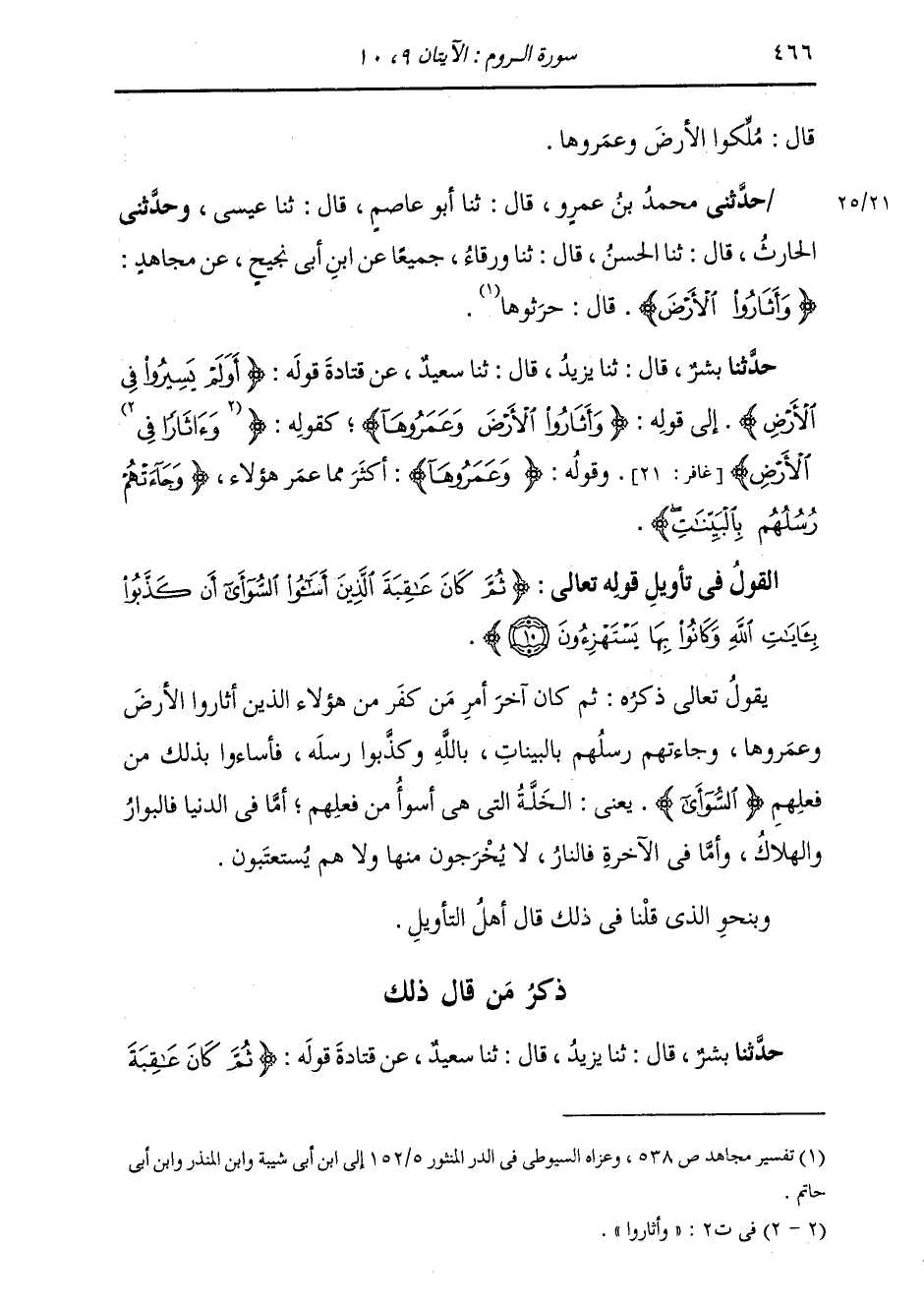 حَدَّثَنِي مُحَمَّدُ بْنُ عَمْرٍو، قَالَ: ثنا أَبُو عَاصِمٍ، قَالَ: ثنا عِيسَى، وَحَدَّثَنِي الْحَارِثُ، قَالَ: ثنا الْحَسَنُ، قَالَ: ثنا وَرْقَاءُ، جَمِيعًا، عَنِ ابْنِ أَبِي نَجِيحٍ، عَنْ مُجَاهِدٍ، " {§وَأَثَارُوا الْأَرْضَ} [الروم: 9] قَالَ: حَرَثُوهَا "