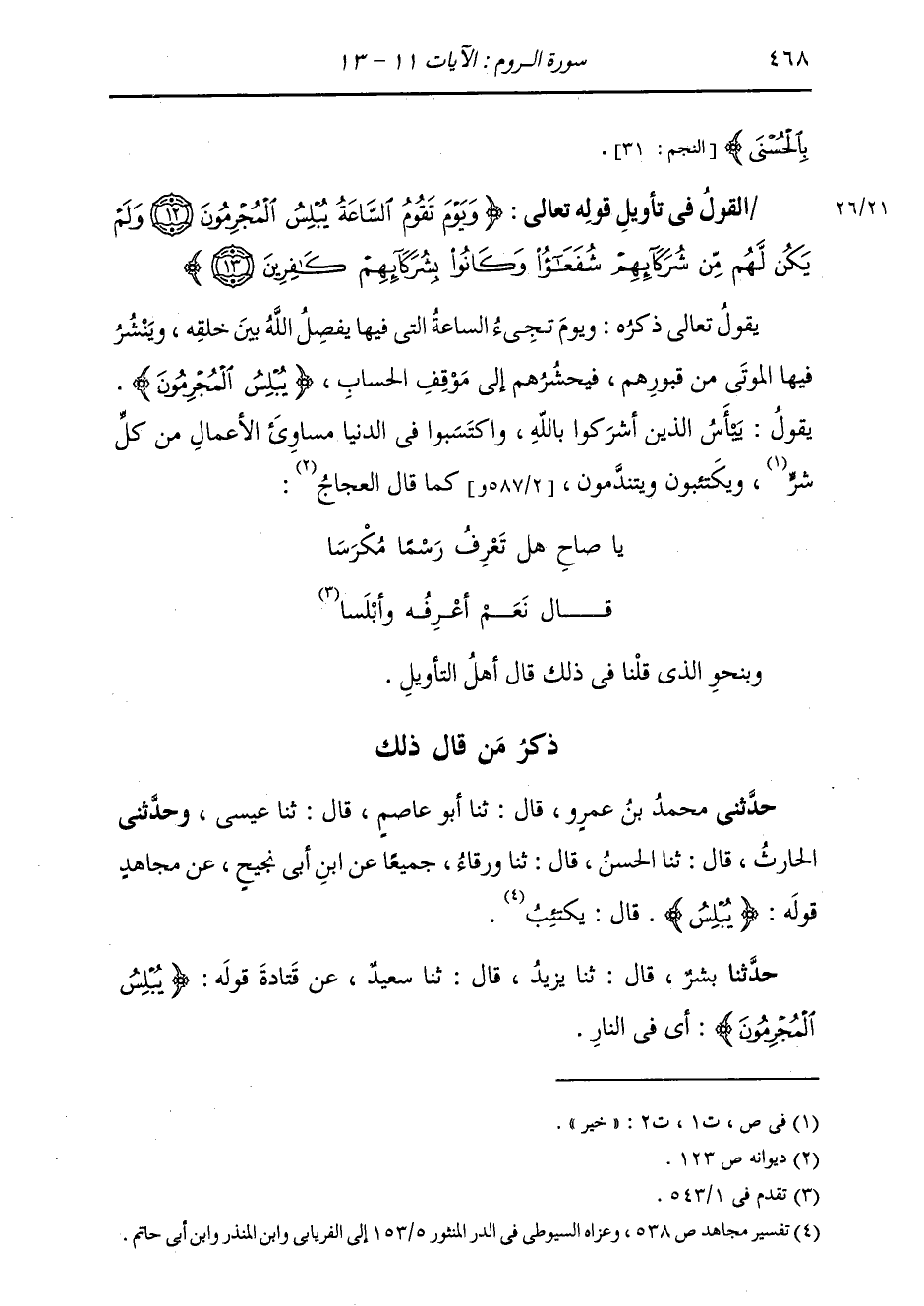 §الْقَوْلُ فِي تَأْوِيلِ قَوْلِهِ تَعَالَى: {وَيَوْمَ تَقُومُ السَّاعَةُ يُبْلِسُ الْمُجْرِمُونَ وَلَمْ يَكُنْ لَهُمْ مِنْ شُرَكَائِهِمْ شُفَعَاءُ وَكَانُوا بِشُرَكَائِهِمْ كَافِرِينَ} [الروم: 13] يَقُولُ تَعَالَى، ذِكْرُهُ: وَيَوْمَ تَجِيءُ السَّاعَةُ الَّتِي فِيهَا يَفْصِلُ اللَّهُ بَيْنَ خَلْقِهِ، وَيَنْشُرُ فِيهَا الْمَوْتَى مِنْ قُبُورِهِمْ، فَيَحْشُرُهُمْ إِلَى مَوْقِفِ الْحِسَابِ، {يُبْلِسُ الْمُجْرِمُونَ} [الروم: 12] يَقُولُ: يَيْأَسُ الَّذِينَ أَشْرَكُوا بِاللَّهِ، وَاكْتَسَبُوا فِي الدُّنْيَا مَسَاوِئَ الْأَعْمَالِ مِنْ كُلِّ شَرٍّ، وَيَكْتَئِبُونَ وَيَتَنَدَّمُونَ، كَمَا قَالَ الْعَجَّاجُ: