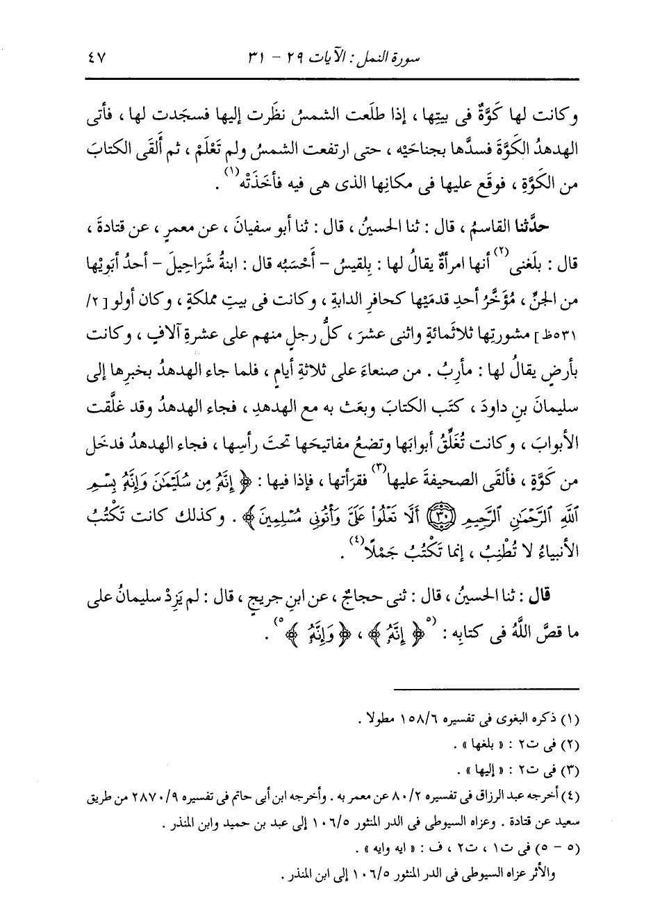 حَدَّثَنَا الْقَاسِمُ، قَالَ: ثنا الْحُسَيْنُ، قَالَ: ثنا أَبُو سُفْيَانَ، عَنْ مَعْمَرٍ، عَنْ قَتَادَةَ، قَالَ: " بَلَغَنِي أَنَّهَا امْرَأَةٌ يُقَالُ لَهَا بِلْقِيسُ، أَحْسِبُهُ قَالَ: ابْنَةُ شَرَاحِيلَ، أَحَدُ أَبَوَيْهَا مِنَ الْجِنِّ، مُؤَخَّرُ أَحَدِ قَدَمَيْهَا كَحَافِرِ الدَّابَّةِ، وَكَانَتْ فِي بَيْتِ مَمْلَكَةٍ، وَكَانَ أُولُو مَشُورَتِهَا ثَلَاثَ مِائَةٍ وَاثْنَيْ عَشَرَ كُلُّ رَجُلٍ مِنْهُمْ عَلَى عَشَرَةِ آلَافٍ، وَكَانَتْ بِأَرْضٍ يُقَالُ لَهَا مَأْرِبُ، مِنْ صَنْعَاءَ عَلَى ثَلَاثَةِ أَيَّامٍ؛ فَلَمَّا جَاءَ الْهُدْهُدُ بِخَبَرِهَا إِلَى سُلَيْمَانَ بْنِ دَاوُدَ، كَتَبَ الْكِتَابَ وَبَعَثَ بِهِ مَعَ الْهُدْهَدِ، فَجَاءَ الْهُدْهُدُ وَقَدْ غُلِّقَتِ الْأَبْوَابُ، وَكَانَتْ تُغْلِقُ أَبْوَابَهَا وَتَضَعُ مَفَاتِيحَهَا تَحْتَ رَأْسِهَا، فَجَاءَ الْهُدْهُدُ فَدَخَلَ مِنْ كَوَّةٍ، فَأَلْقَى الصَّحِيفَةَ عَلَيْهَا، فَقَرَأَتْهَا، فَإِذَا فِيهَا: {§إِنَّهُ مِنْ سُلَيْمَانَ وَإِنَّهُ بِسْمِ اللَّهِ الرَّحْمَنِ الرَّحِيمِ. أَلَّا تَعْلُوا عَلَيَّ وَأْتُونِي مُسْلِمِينَ} [النمل: 31] وَكَذَلِكَ كَانَتْ تَكْتُبُ الْأَنْبِيَاءُ لَا تُطْنِبُ، إِنَّمَا تَكْتُبُ جُمْلًا "